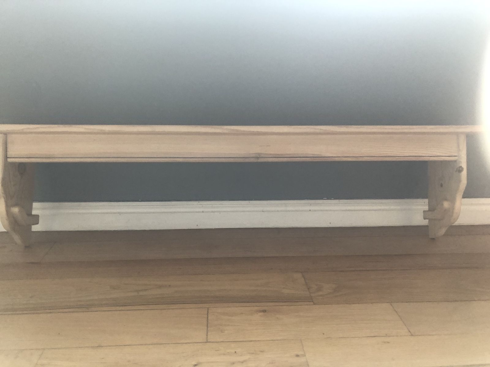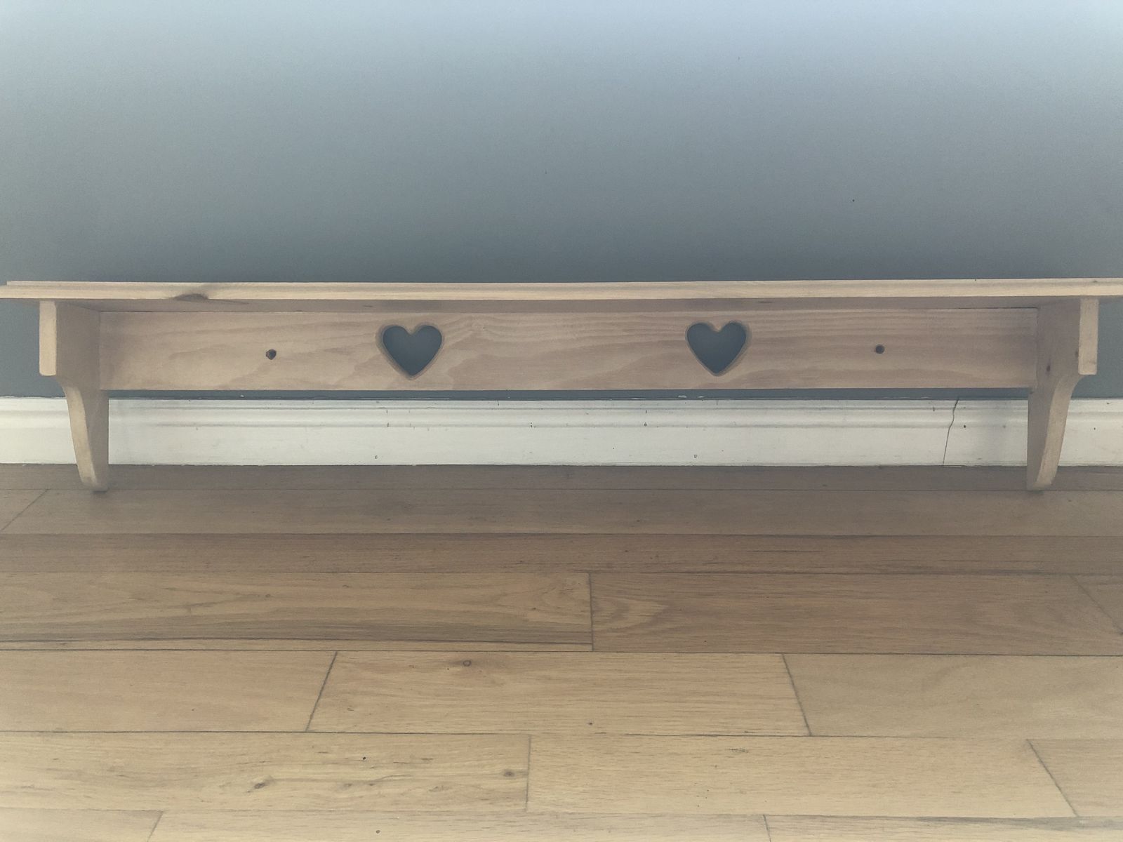 Heart shelf: 46”L x 5 1/2”W x 6”H Shelf w/4 pegs: 48”L x 7 1/2”W x 8”H Shelf w/rod hanger: 47 1/2”L x 7”W x 11 1/2”H All shelves are solid wood. $20.00 each. Must pick up