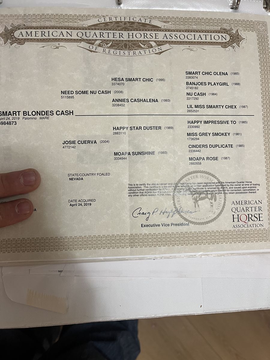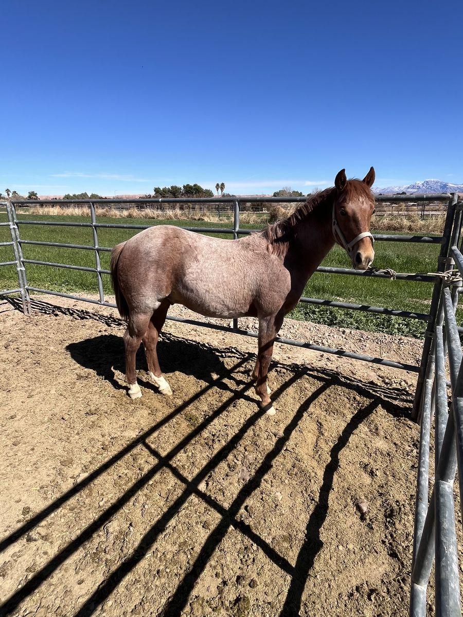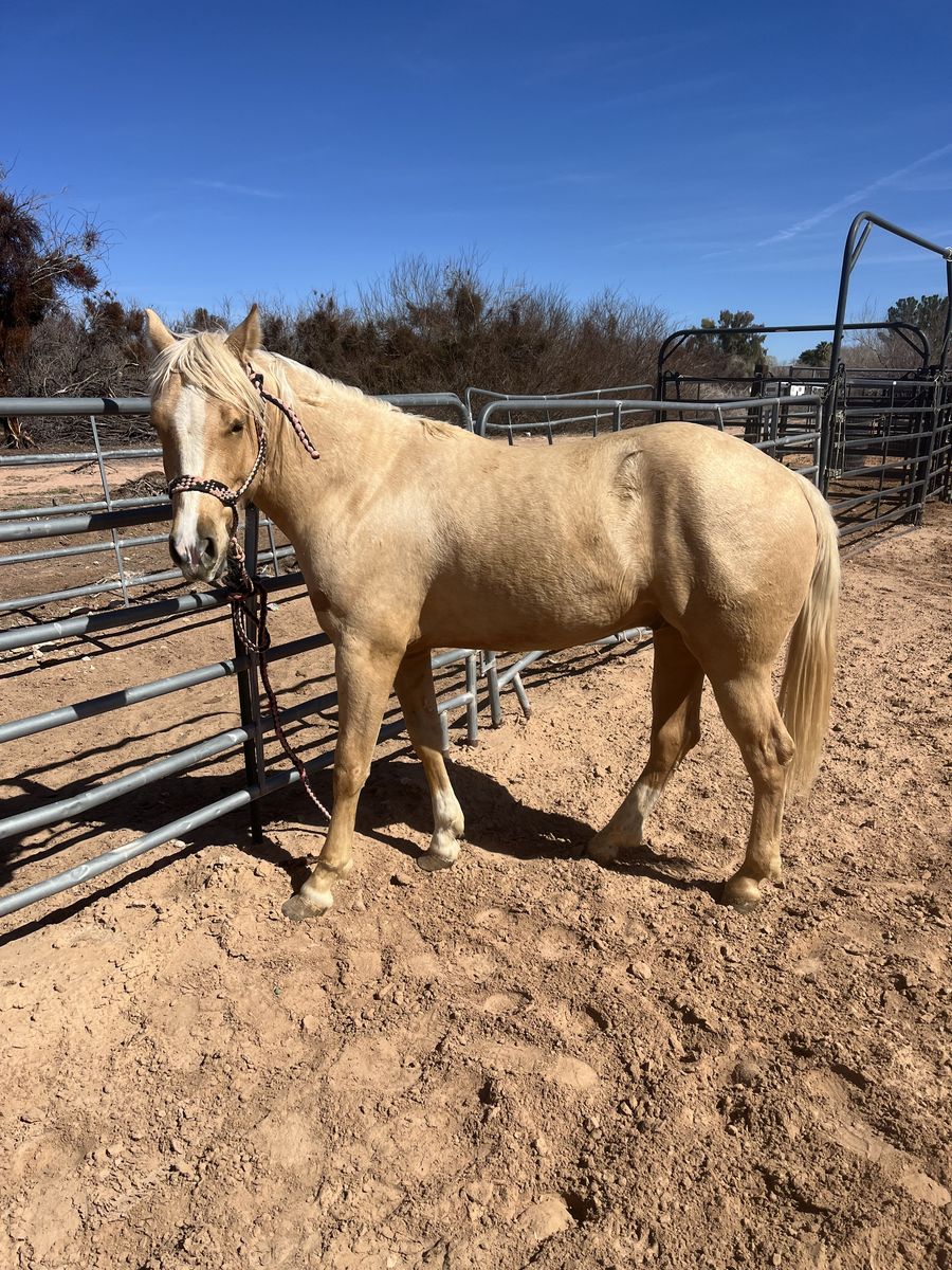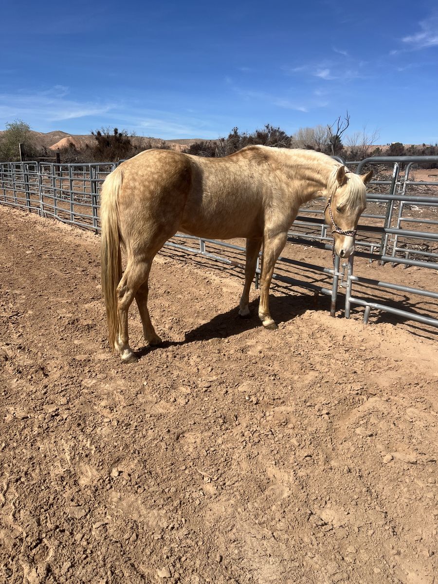 2019 AQHA palomino mare. Well bred flashy mare. She’s had two excellent looking colts out of our stud and is currently being bred back. Easy keeper. Approximately 15 hands. Working cow horse bloodlines. Broodmare sound. Pictures of colts included. Logandale Nv