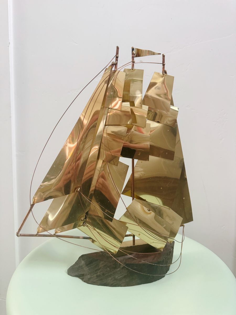 VenmoVintage Mid Century Brass & Copper Sailboat Boat Ship Sculpture Mounted on Wood Base