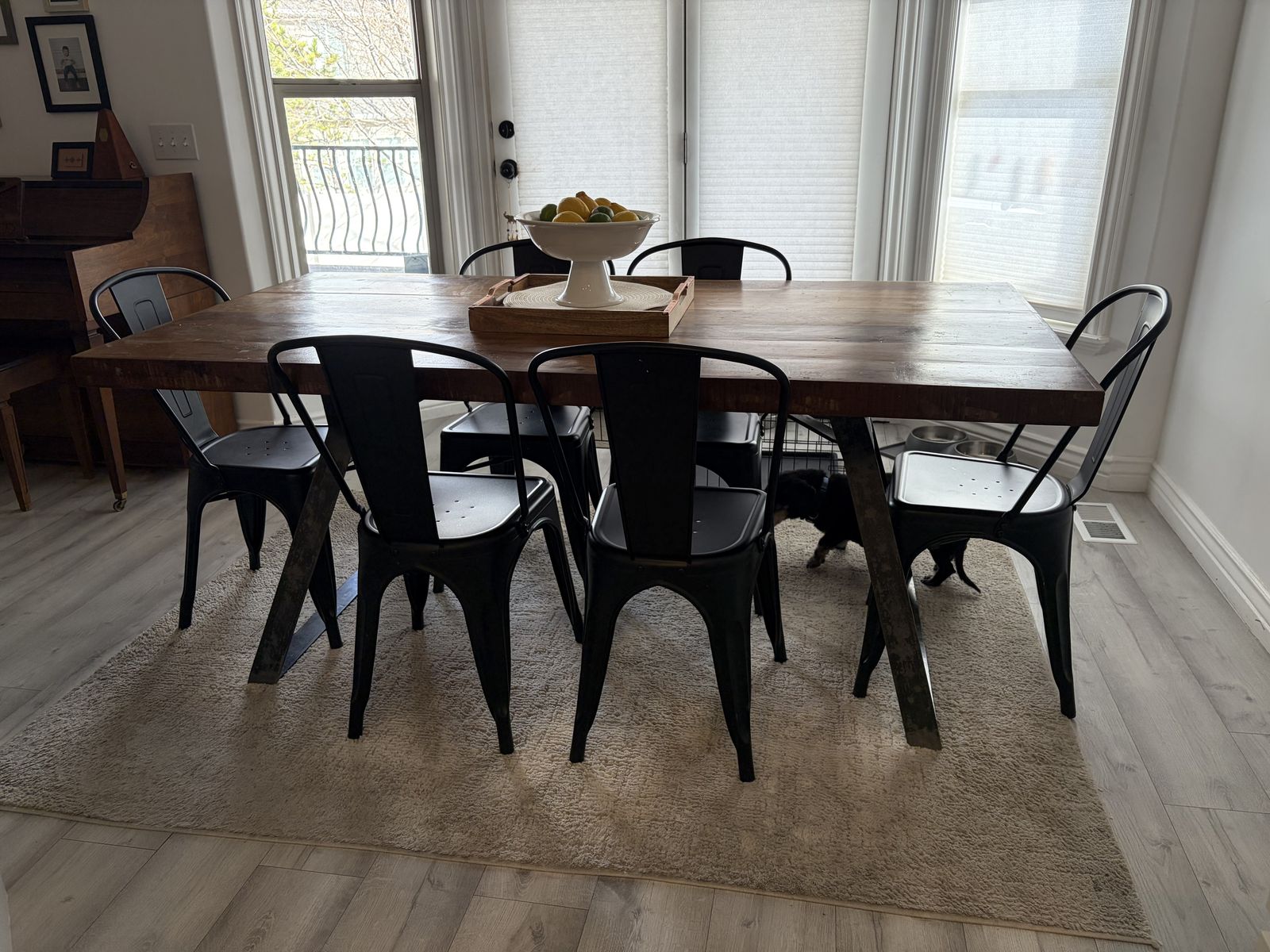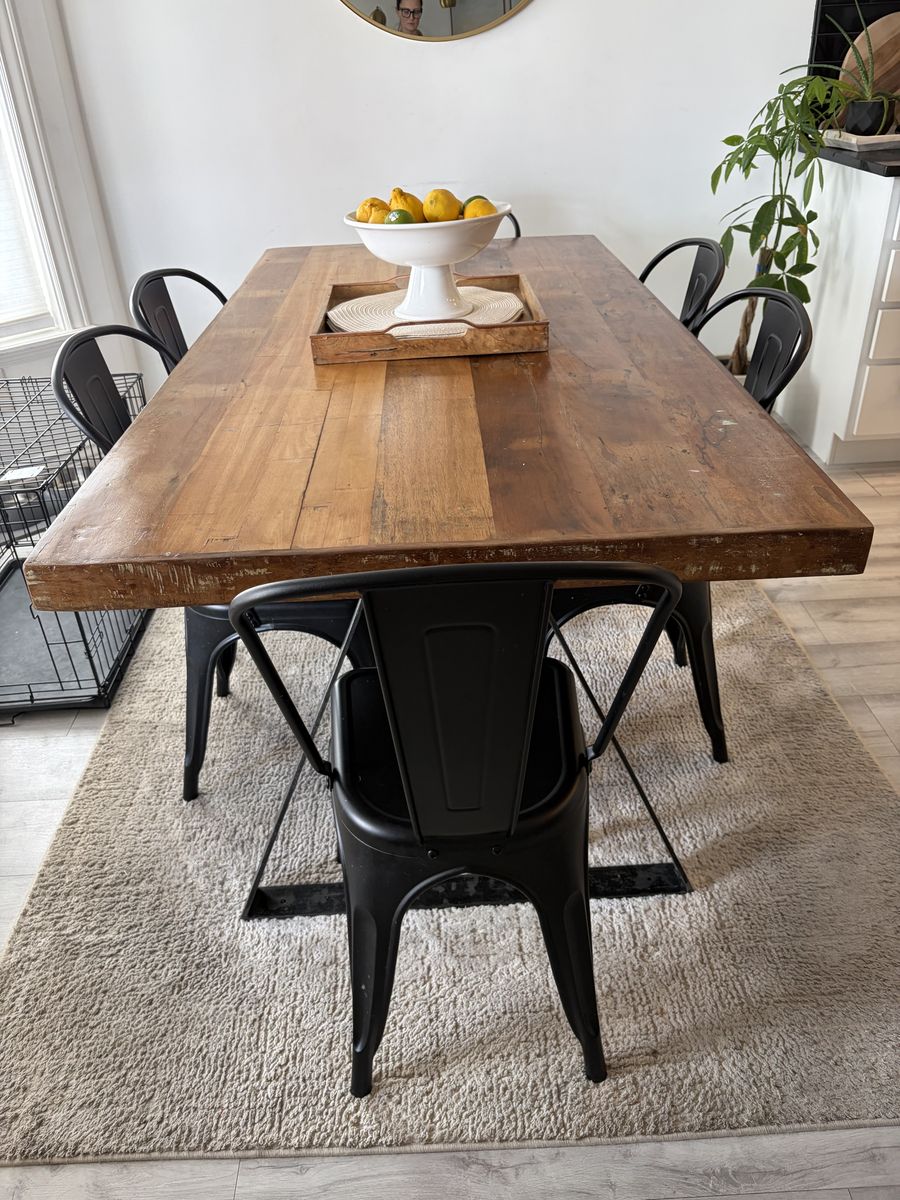 VenmoLarge mango wood and iron farmhouse dining table that also includes 6 black metal chairs as a set.