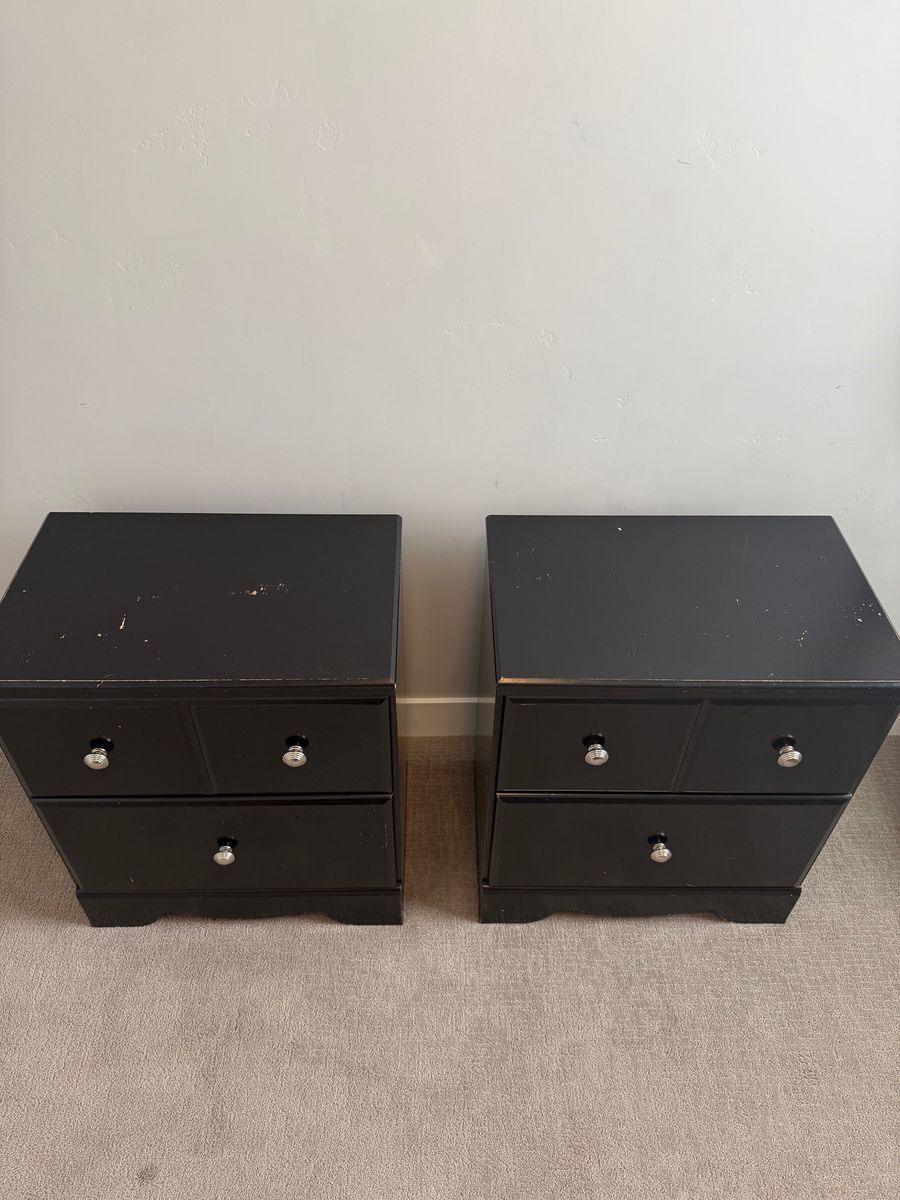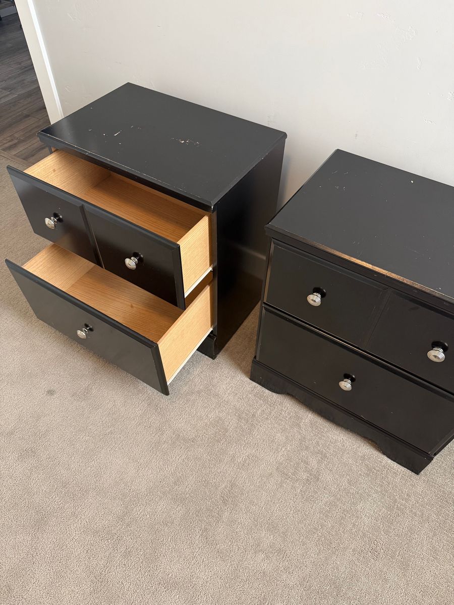 VenmoUpgrade your bedroom with this sleek pair of black nightstands featuring elegant silver hardware. These pieces are gently used and still have plenty of life left! Details: Classic black finish Modern silver drawer pulls Solid, sturdy construction Smooth-opening drawers Majority of scuffs are on the top surface (see photos) These nightstands are structurally strong and perfect for adding a clean, modern touch to any bedroom. Great for guest rooms, apartments, or starter homes! Priced to sell — message me with questions or to arrange pickup in Herriman! $80 for the set!