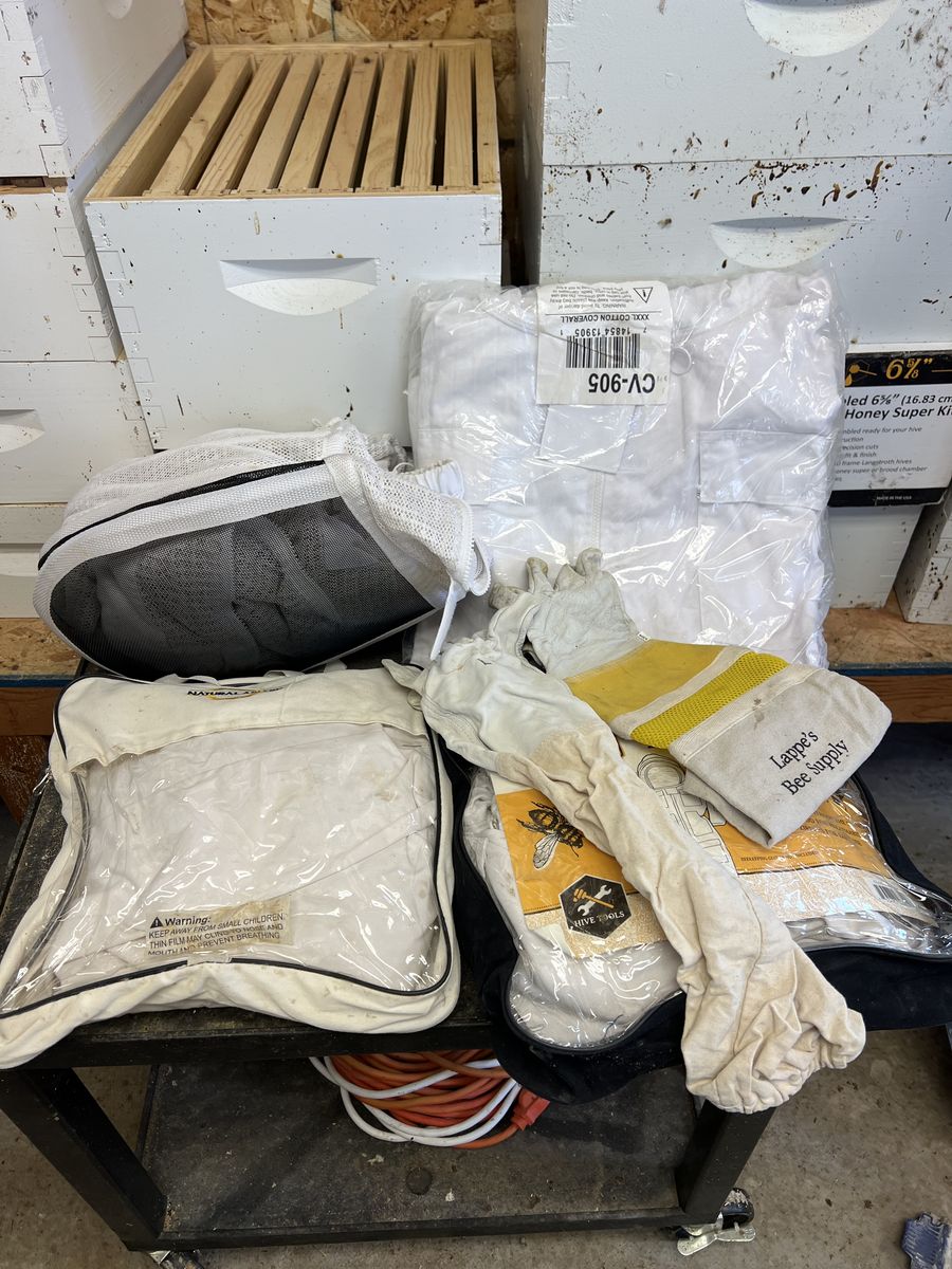 Asking: $ 15 for the empty Supers $ 20 for empty brood boxes $ 20 for Supers with frames $25 for brood boxes with the frames $ 1200 for the Maxant honey extractor $50 for the 2 frame extractor $ 300 for the Provap 110 $15 for the smoker $ 30 for each bee suit $10 each for bottom boards and lids $ 200 Uncapping kit $ 20 for the box of new card board nuc boxes
