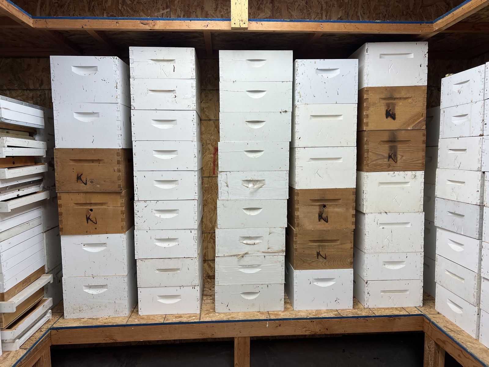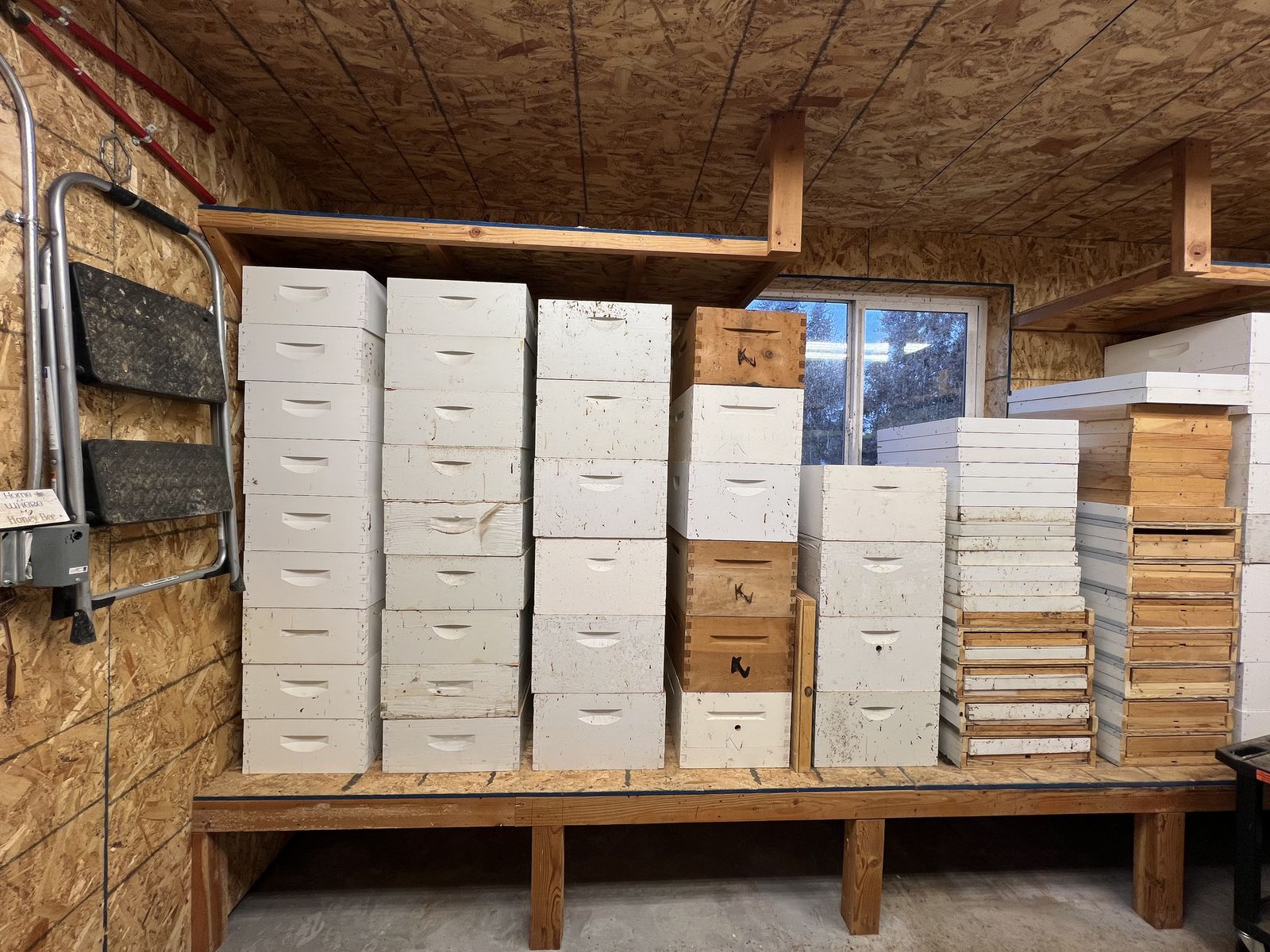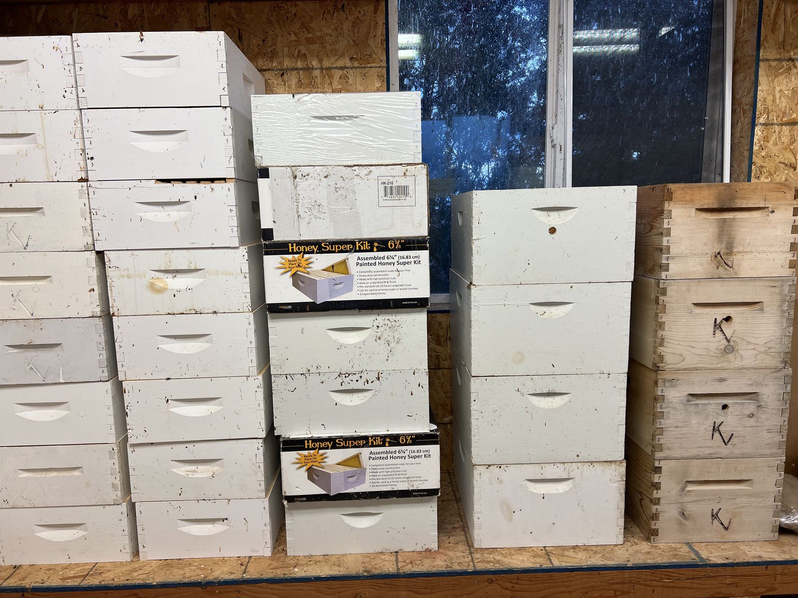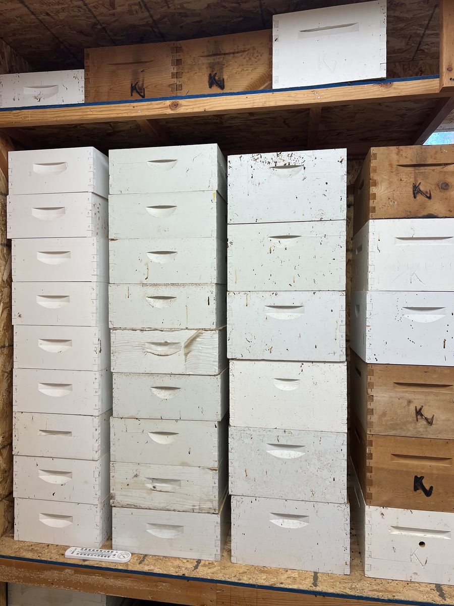 Tons of beekeeping equipment! Everything you need for your own apiary! I’ve got both 10 and 8 frame boxes. The bottom boards and lids were modified to go in a bee house building. As shown in the pictures, most of the bottom boards and lids have a piece cut off. Would need some fixing up to make them usable. Not all of the boxes have frames in them. And some of them are totally new. 25 10 frame supers 24 10 frame brood boxes 7 8 frame brood boxes 39 8 frame supers