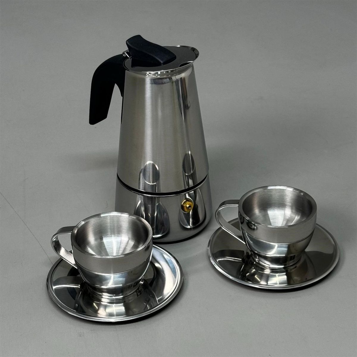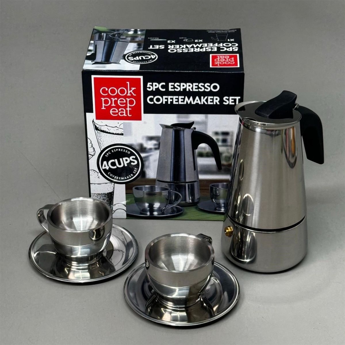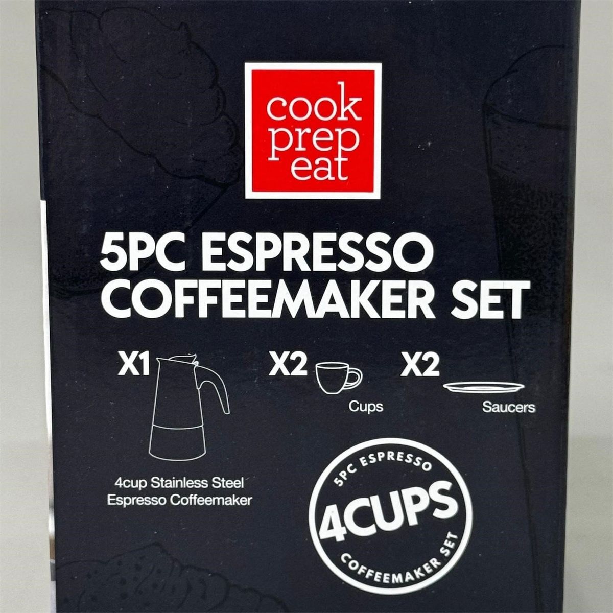 Cook Prep Eat 5PC Espresso Coffeemaker Set. Complete with Coffeemaker, 2 cups, & 2 saucers. Quick and easy for that early morning or midday cup of your favorite Espresso. 758891843885