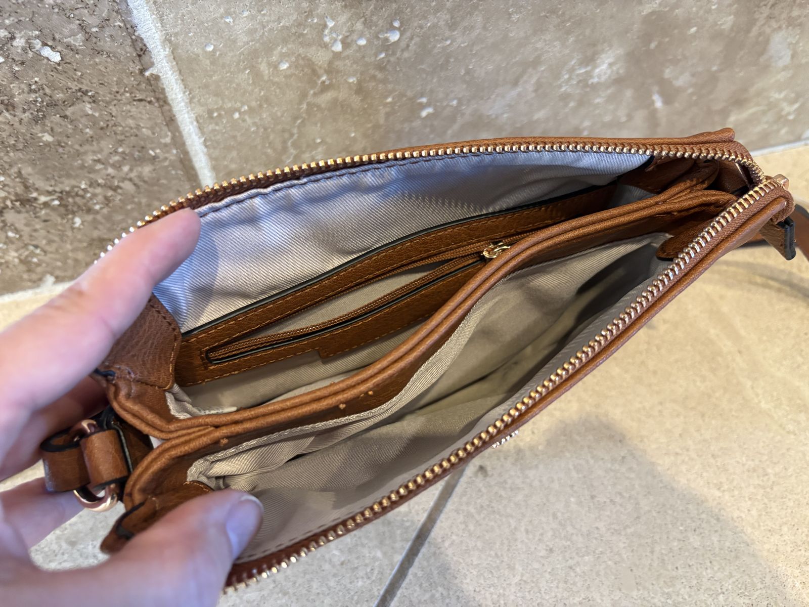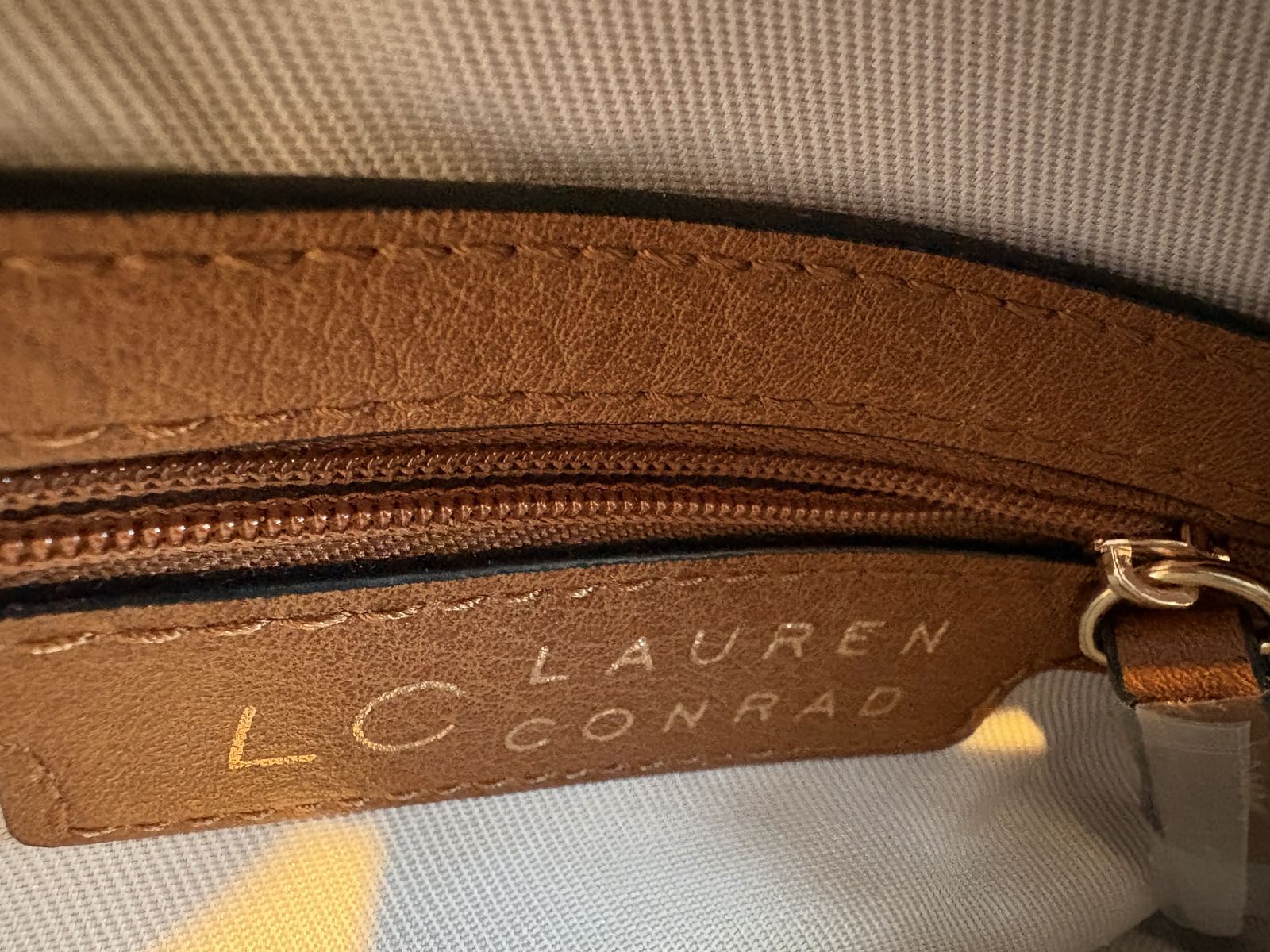 I have a brown LC Lauren Conrad crossbody purse or handbag. It looks like leather but I assume it’s faux. It has gold accents - small flower, zipper top and buckle on strap. It is 8 3/4 inches wide and 6 1/2 inches tall. It has a long adjustable strap for shoulder or crossbody. It has 2 main compartments with a small zipper pocket in one of them. It’s in great condition. See my other ads for jewelry, artwork, home decor and more.