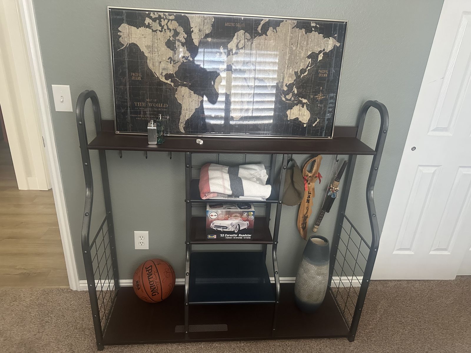 Features: • Multiple sturdy hooks on both sides for coats, hats, bags, keys, umbrellas • Open top shelf for decor (perfect for pictures, plants, or display – as shown with world map) • 3 tiered shelves in the center for shoes, baskets, folded blankets, books, or storage bins • Bottom open shelf/base with mesh for shoes, sports gear (basketball fits perfectly!), or ventilation • Dimensions: 51.75” wide x 48” high x 15.75” deep – fits nicely in hallways, laundry rooms, mudrooms, or entryways without taking too much space Solid build from a trusted brand (Ashley Signature Design), clean from a smoke-free home. Minor normal wear only (no major scratches/damage – see clear photos). Easy to move, no disassembly needed. New similar pieces run $200–$400+. Priced WAY below for a fast pickup – won’t last long!