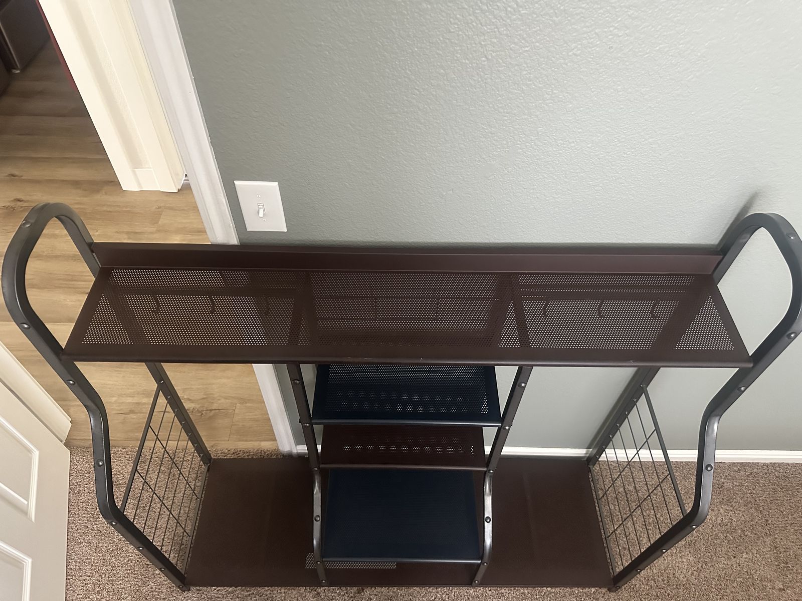 ZelleFor quick sale: Ashley Furniture Signature Design entryway organizer / hall tree! Sturdy metal frame in dark gray/black with rich brown shelves – modern industrial vibe that looks great in any home.
