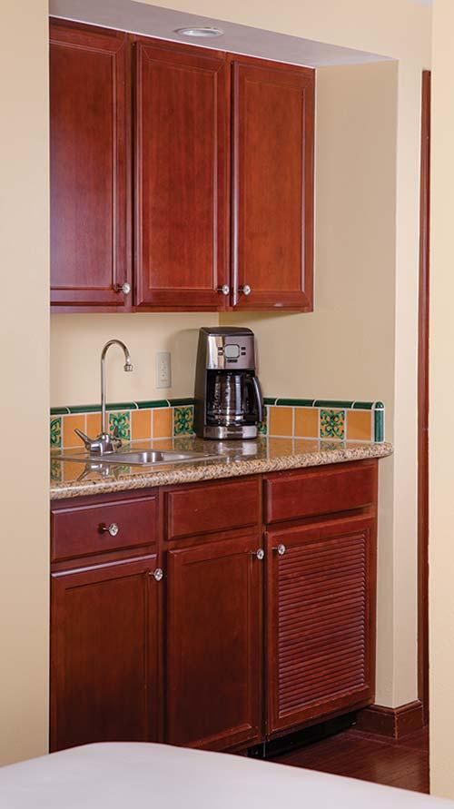 This is a studio condo, sleeps 4. The condo has a small fridge, sink, and microwave. There is a deck (lanai) with a guaranteed ocean view. The sitting area includes a couch that folds out into a queen bed. There is also a queen bed.
