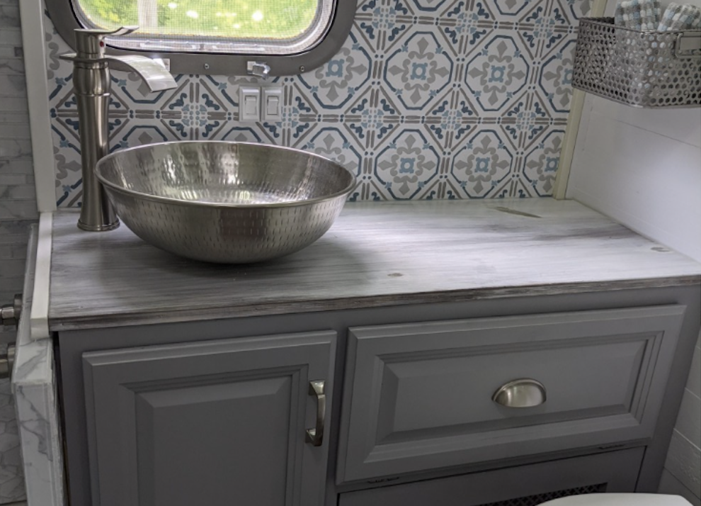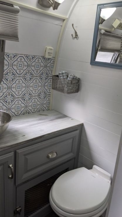 Bathroom is entirely redone and over the top amazing with fully tiled shower, nickel shower hand spray, waterfall faucet and vessel sink. Plumbing updated to pex and dometic 310 high profile toilet installed as well as new ceiling vent/fan; the handpainted wallpaper backsplash is yet another one of a kind highlight.