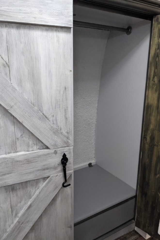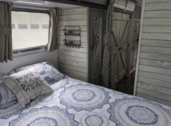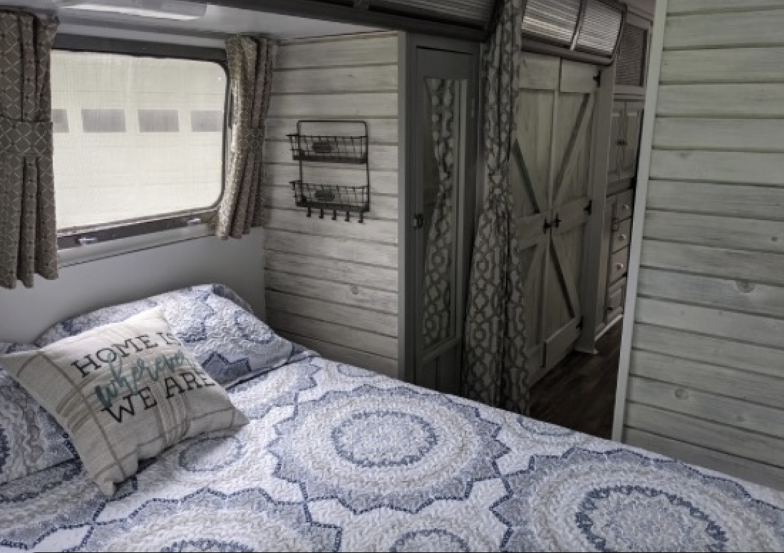 In the bedroom, the full size bedframe was completely rebuilt with easy access storage from 2 sides, custom built nightstand and clothes closet provide additional storage space.