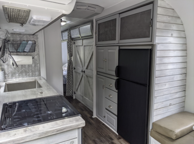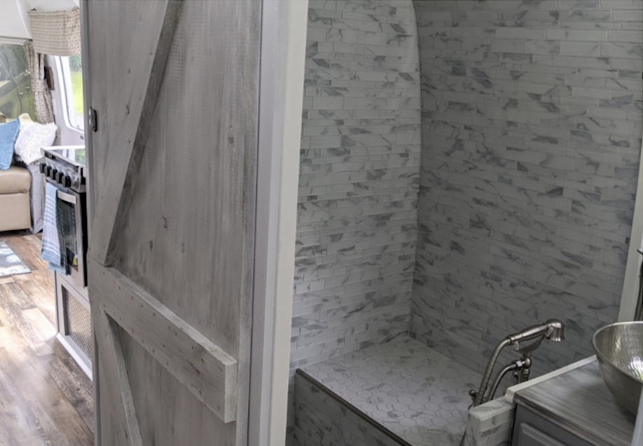 Featuring unique hand stained and whitewashed shiplap accent walls and barn -style doors, new vinyl waterproof flooring, custom solid wood cabinetry and countertops and a full tile shower, this is a high end unique travel trailer with iconic Airstream exterior.