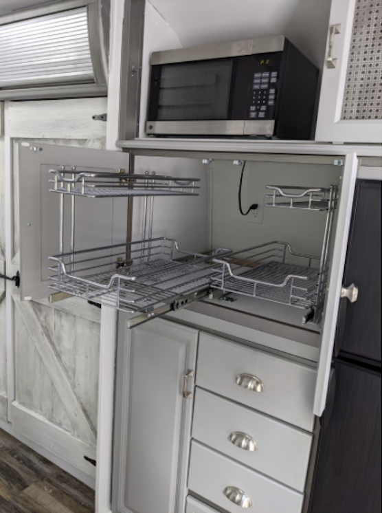 Kitchen was rebuilt with solid maple doors painted a gorgeous gray, pullout stainless pantry shelves added, new dometic 3 way fridge 7 cu ft capacity with black stainless panels, new gas range/oven with glass top, deep single bowl stainless sink and touch free pull down faucet.