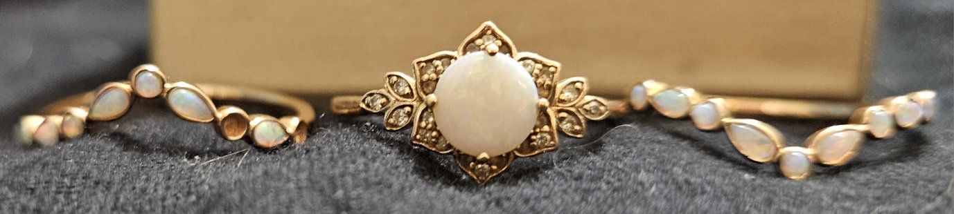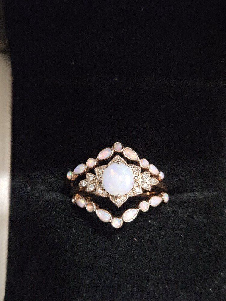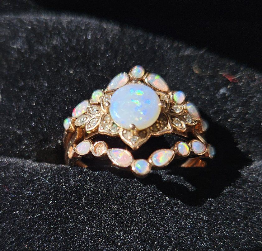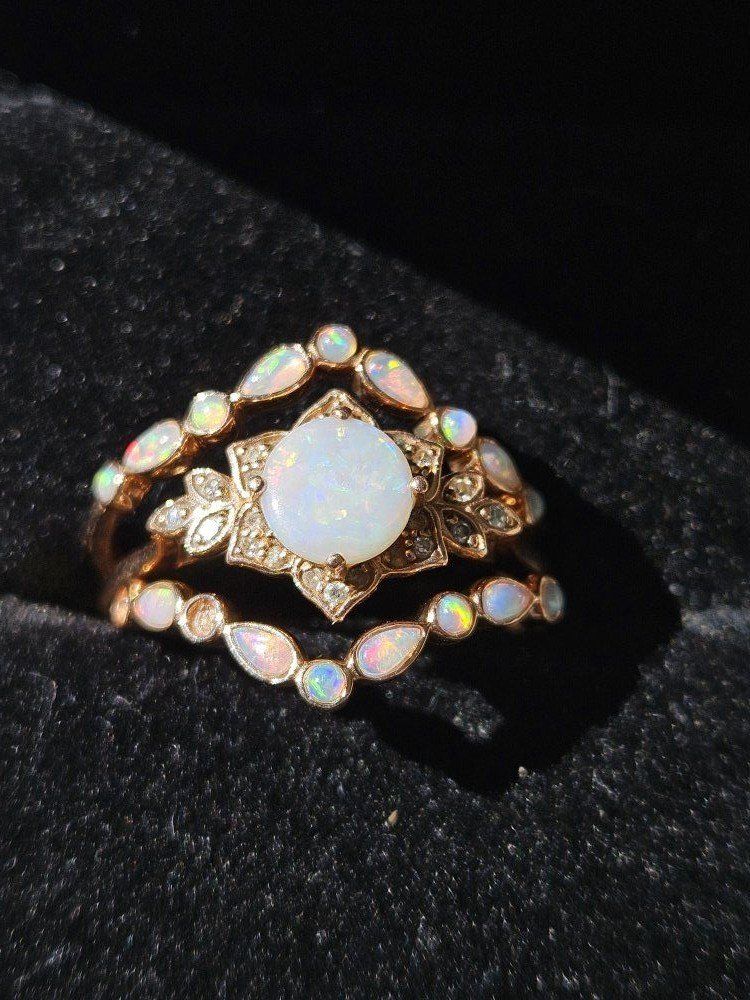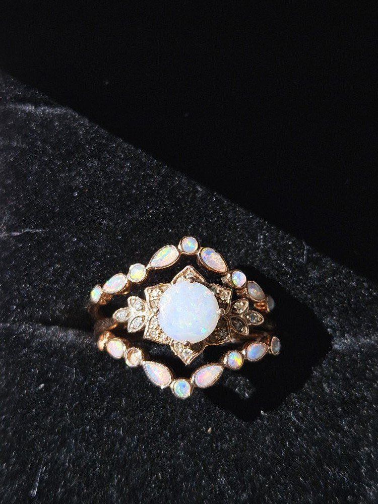 The metal is 14k rose gold, the opals are lab opal (I read that lab opals are stronger and less likely to crack or break like natural opals), and the gems, to my knowledge, are moissanite rather than diamonds.
