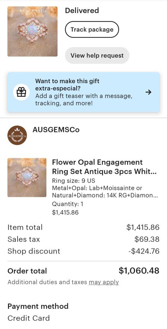 This is a custom piece from AUSGEMSCo, an independent jewelery maker from Australia, and the rings were originally priced at $1,415.86. However, because of a sale I obtained the rings for $1,060.48 as seen in the photo. I am asking for $800 for the rings.