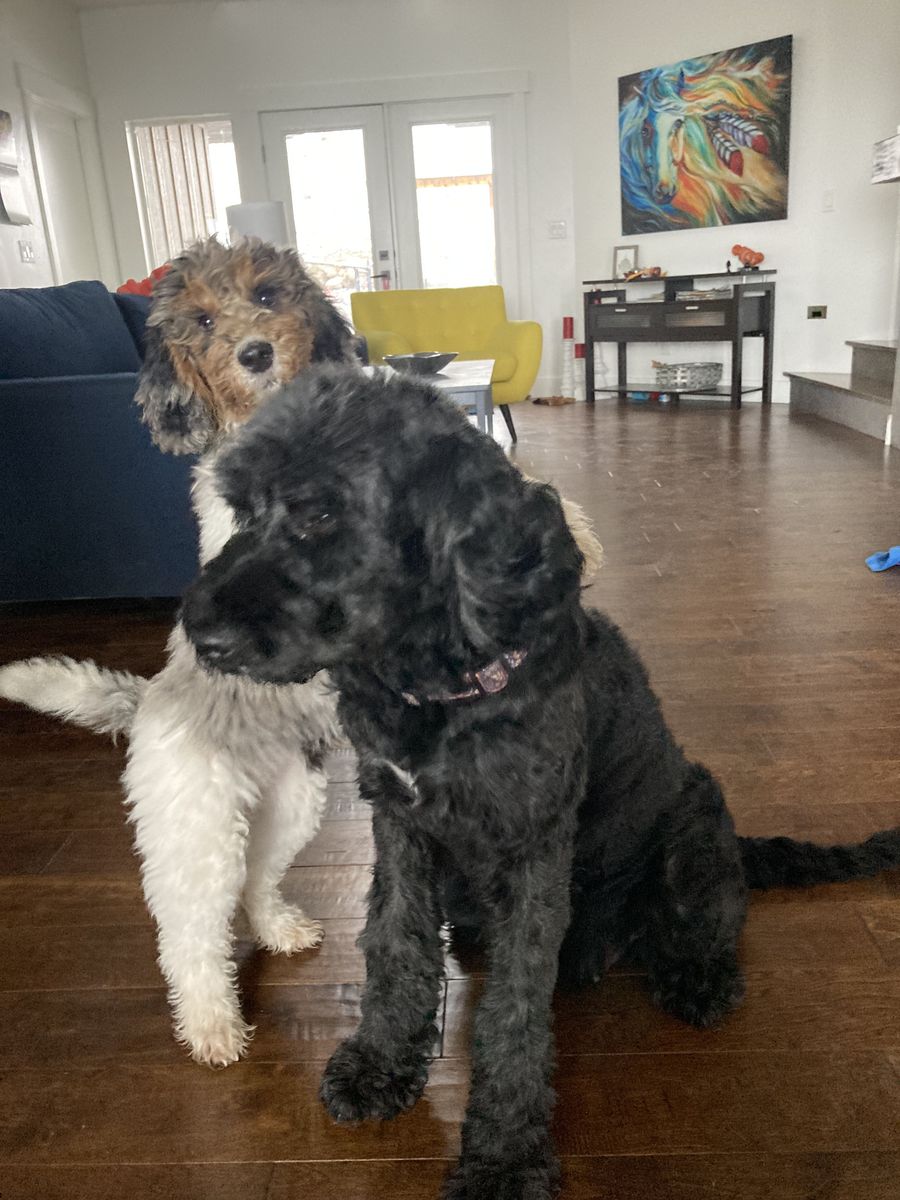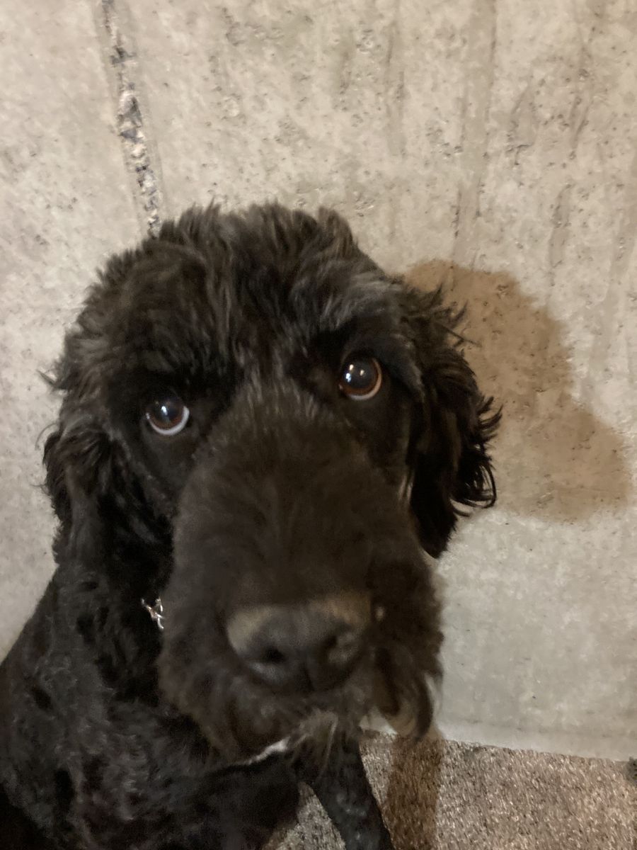 Ebs, Ebony, Sweet Mama (black) is a Newfiepoo, who is 7 years old. So sweet and wonderful with all kids, super shy Mama who loves like no other. She is about 24 inches and weighs around 70lbs, she is one solid lady. She just needs the sweetest spot, I got this lady later in life and it took me 6 months to get her to trust me and take treats out of my hand, now she is the most loyal girl, gonna to be hard to let go.