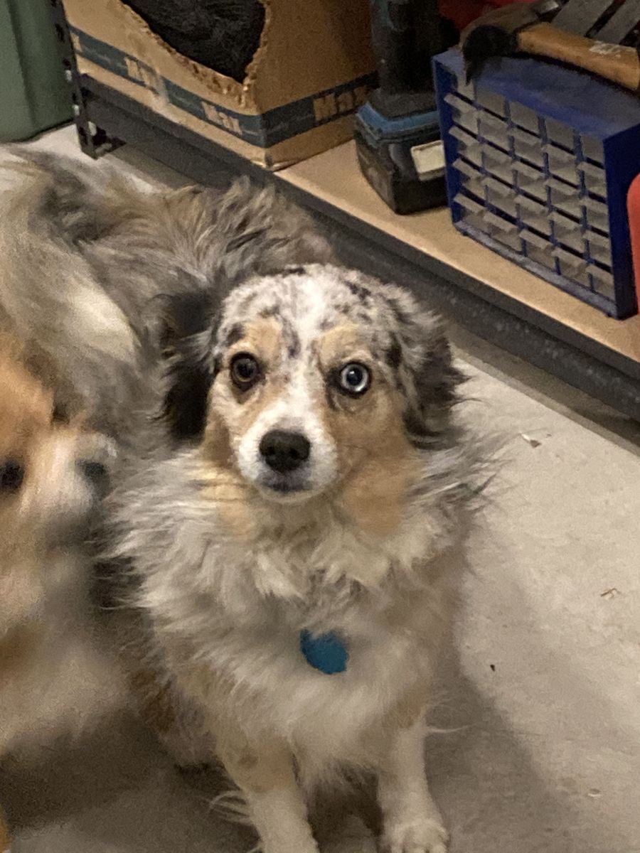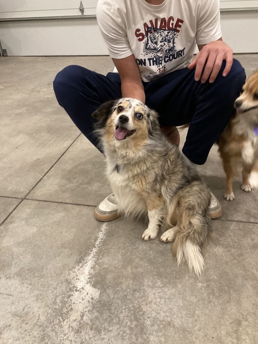 Sky, Sky Blue, Skyote (tri colored merle) is an Australian shepherd/papillion cross, who is 10 years old. Weighs about 12lbs and 12 inches tall, she is great with my daughter. Not really sure I can let her go but if it was the perfect fit I would consider.