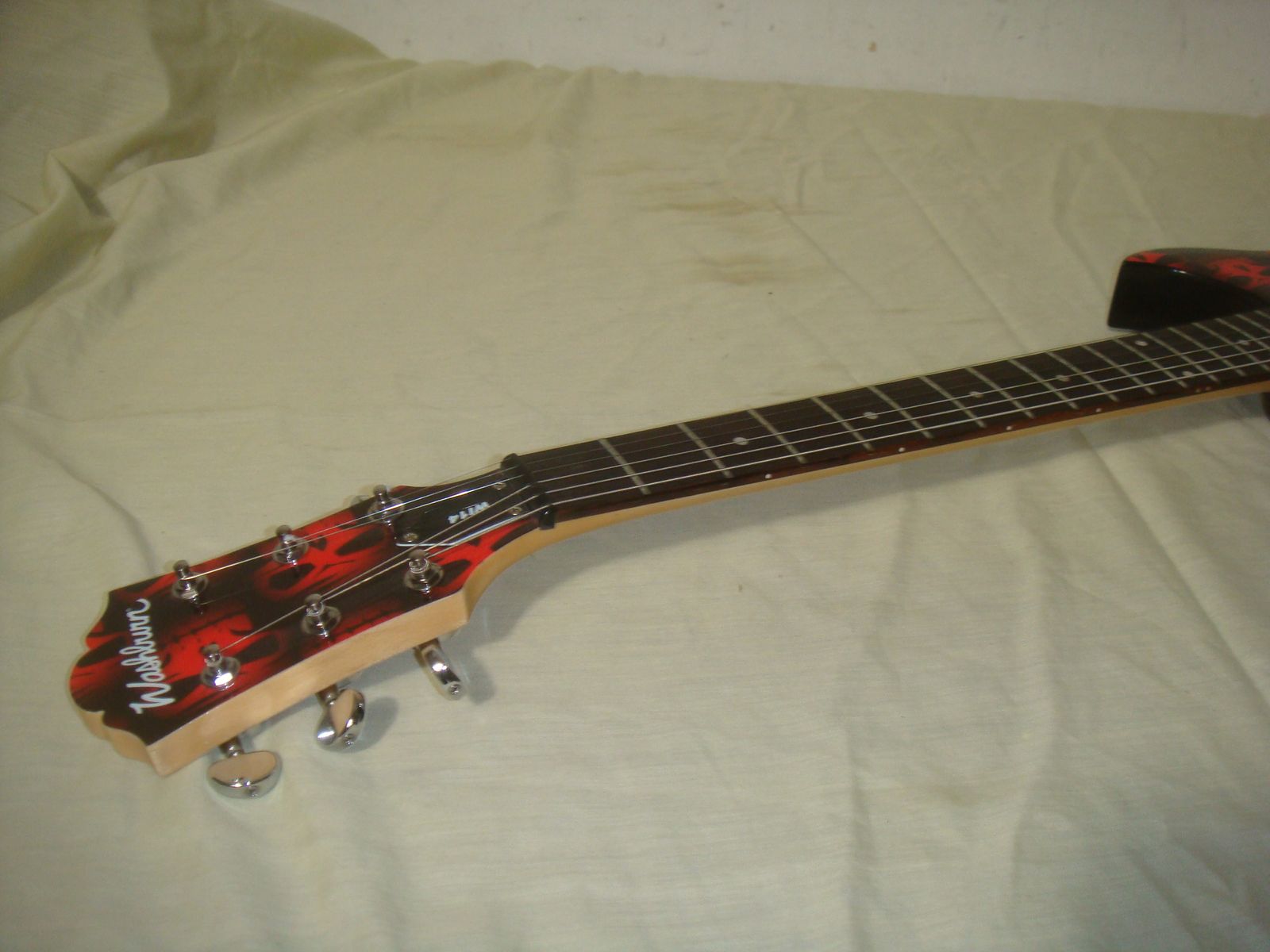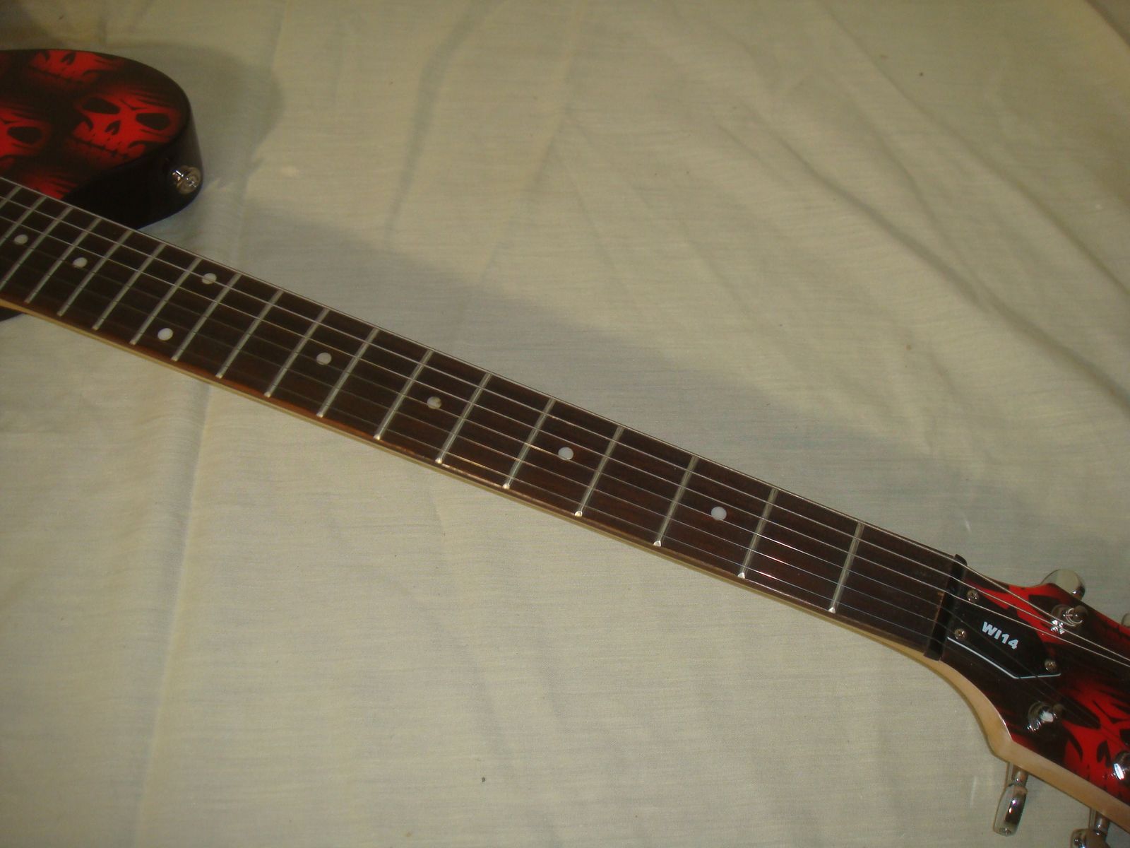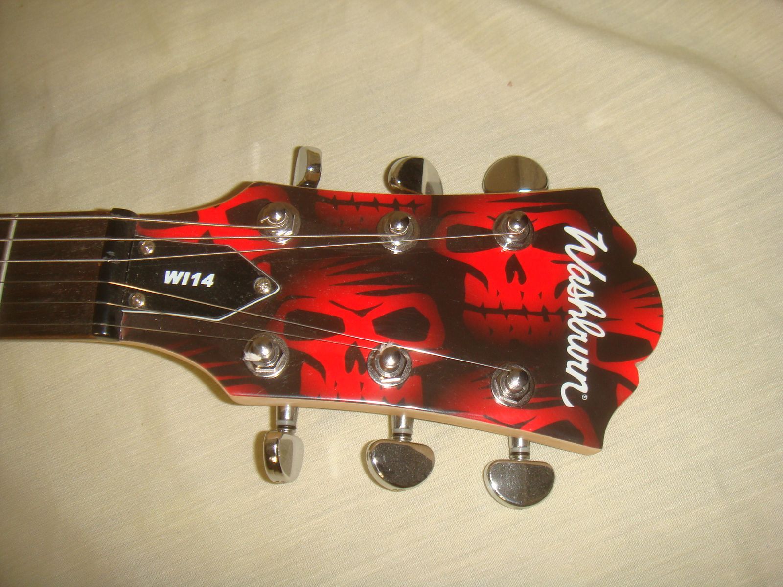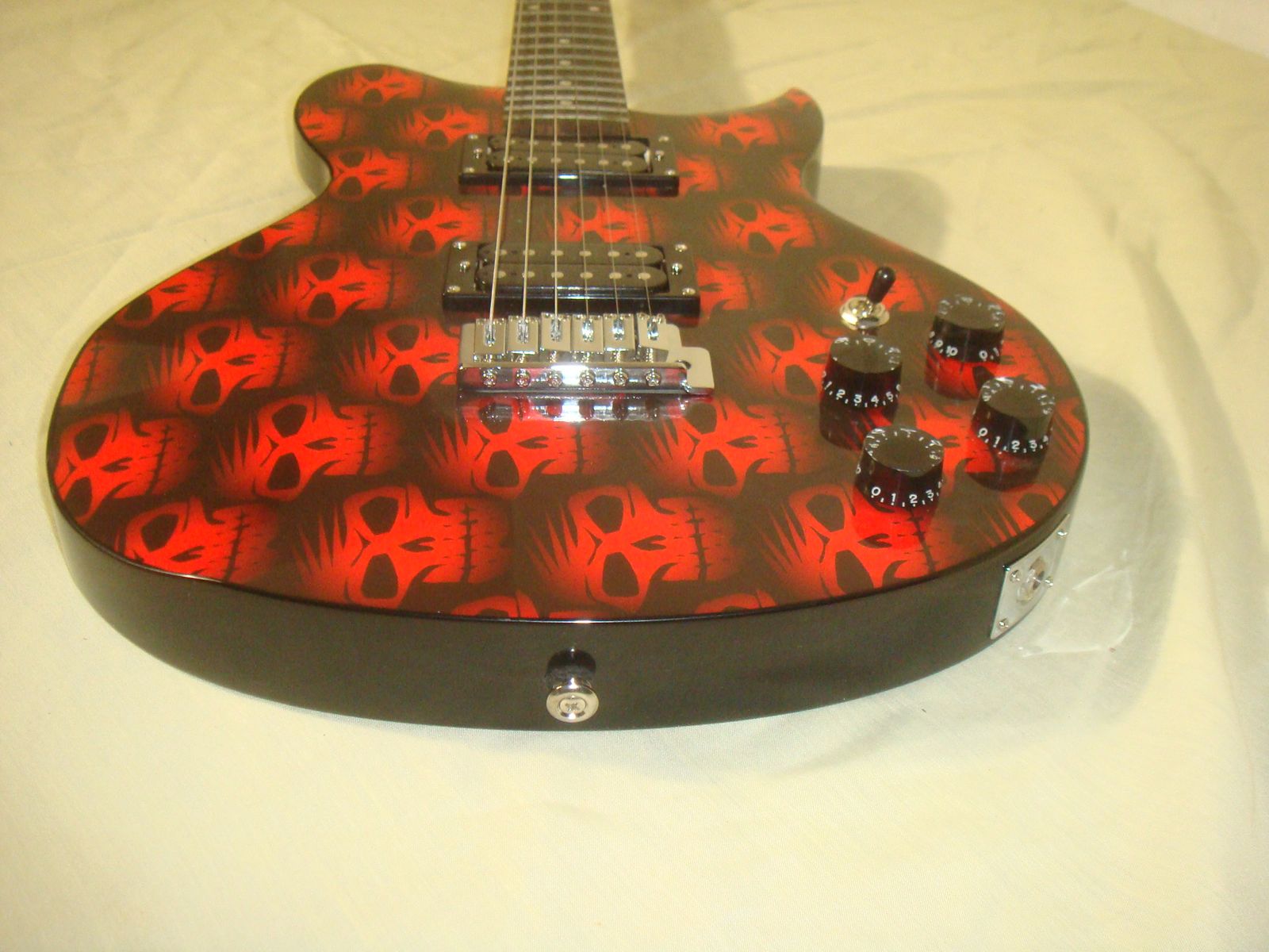 WASHBURN WI14 IDOL ELECTRIC GUITAR IN BLACK WITH RED SKULLS. This is a super cool and rare finish and the guitar is in like new condition with hardly a mark on it! It comes with everything shown. This is your chance to save big-time so don't miss out!!