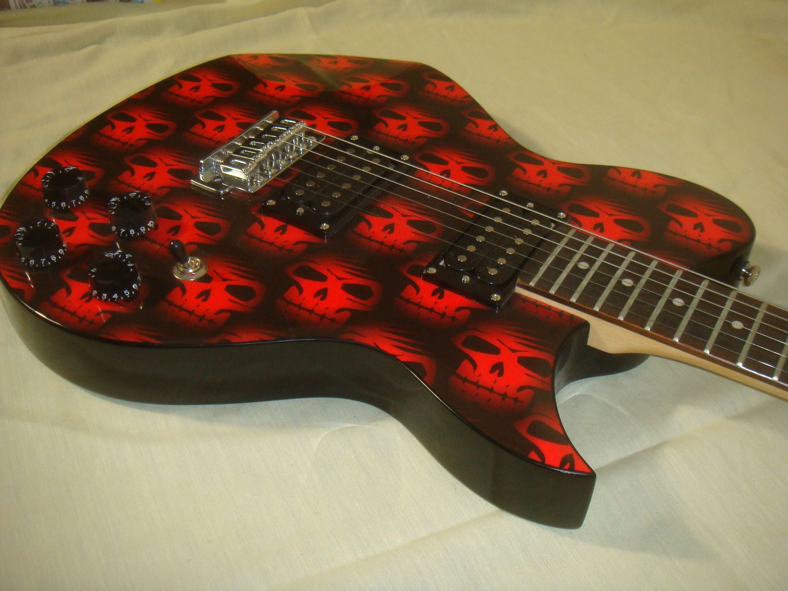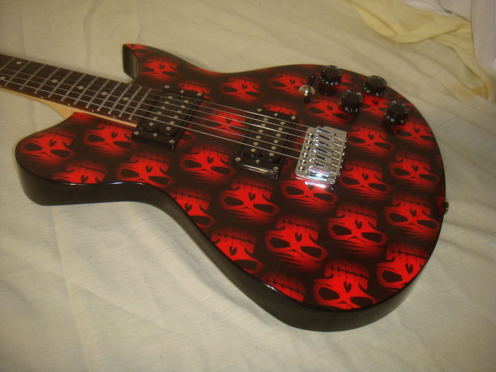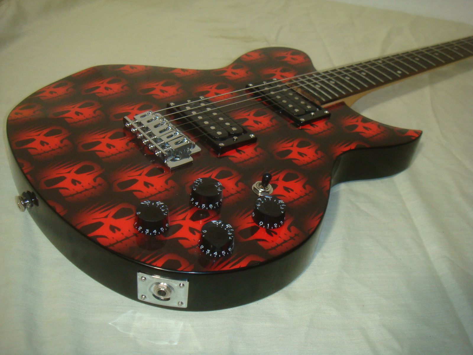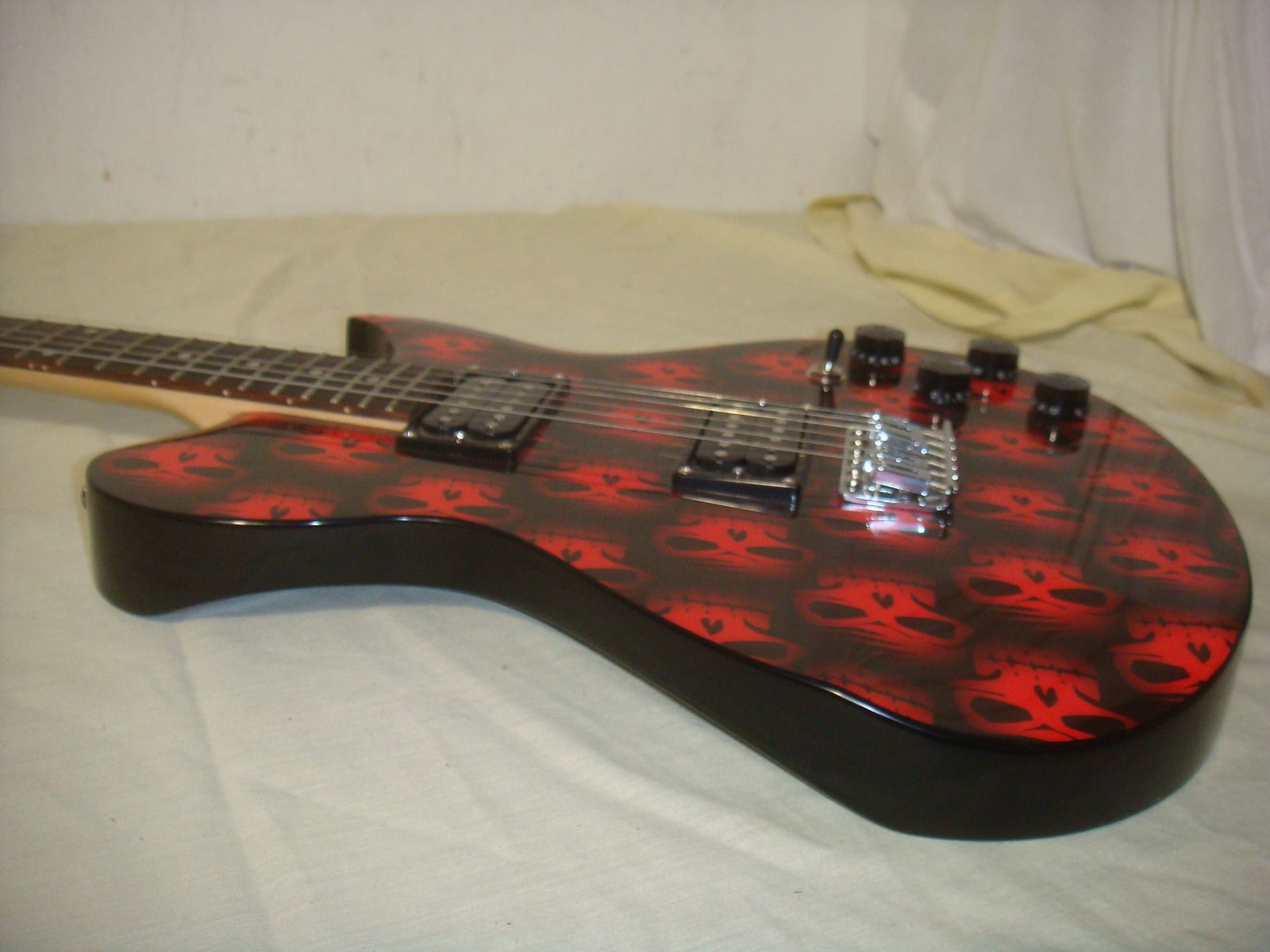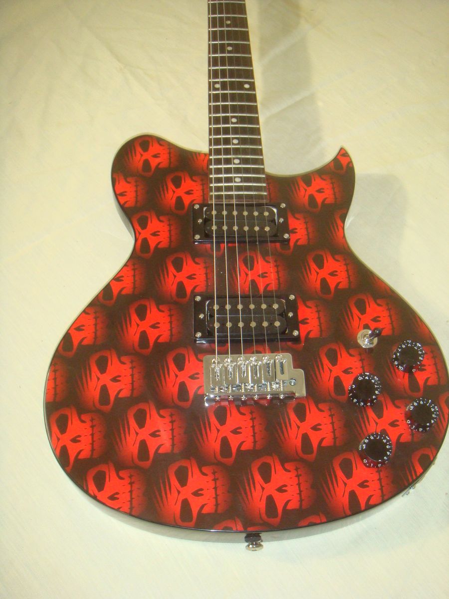 WASHBURN WI14 IDOL ELECTRIC GUITAR IN BLACK WITH RED SKULLS. This is a super cool and rare finish and the guitar is in like new condition with hardly a mark on it! It comes with everything shown. This is your chance to save big-time so don't miss out!!