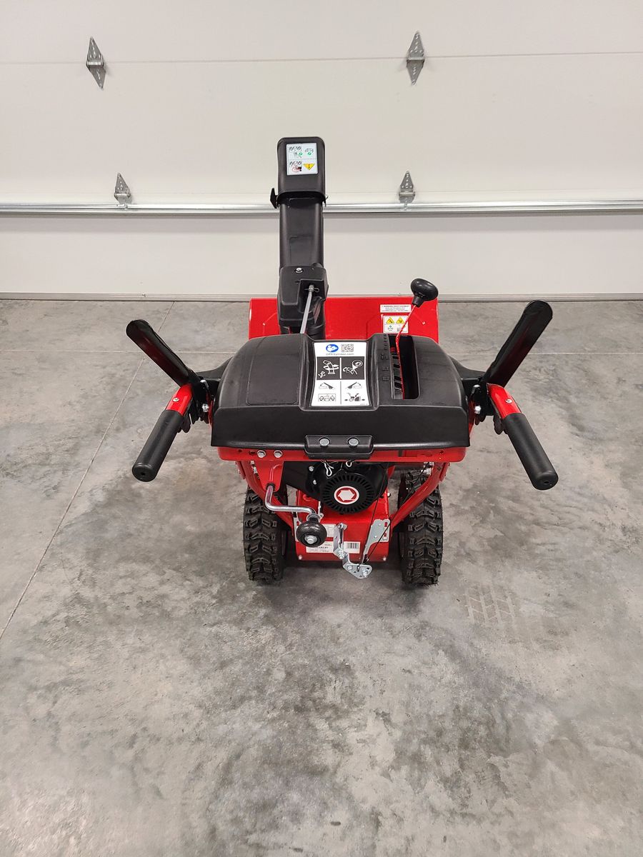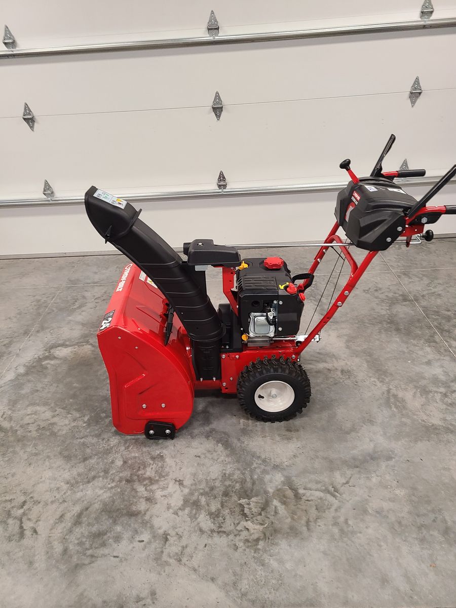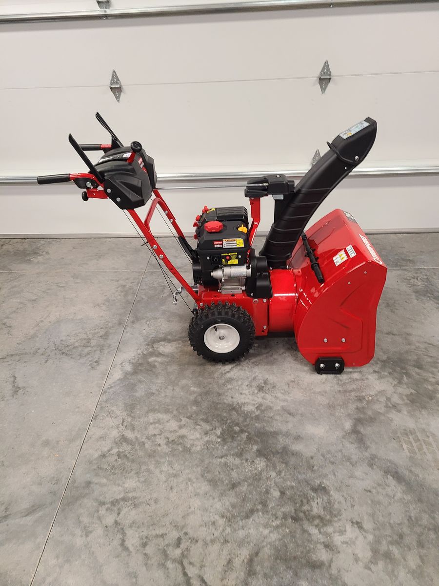 Like new Troy-Bilt Storm 24 in. 208 cc Two- Stage Gas Snow Blower with Electric Start. Self-propelled drive with choice of 6 forward and 2 reverse speeds, 12-in. serrated steel augers, extended chute, and a center-mount chute crank. Over $1100 new.