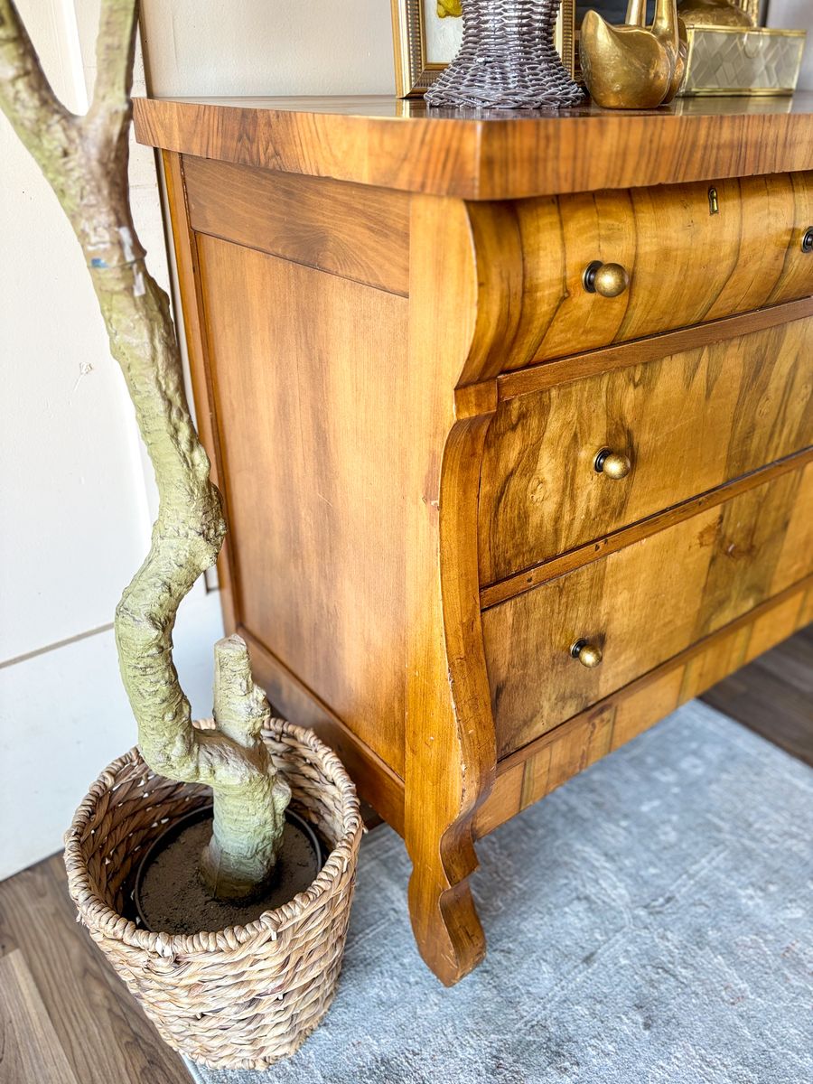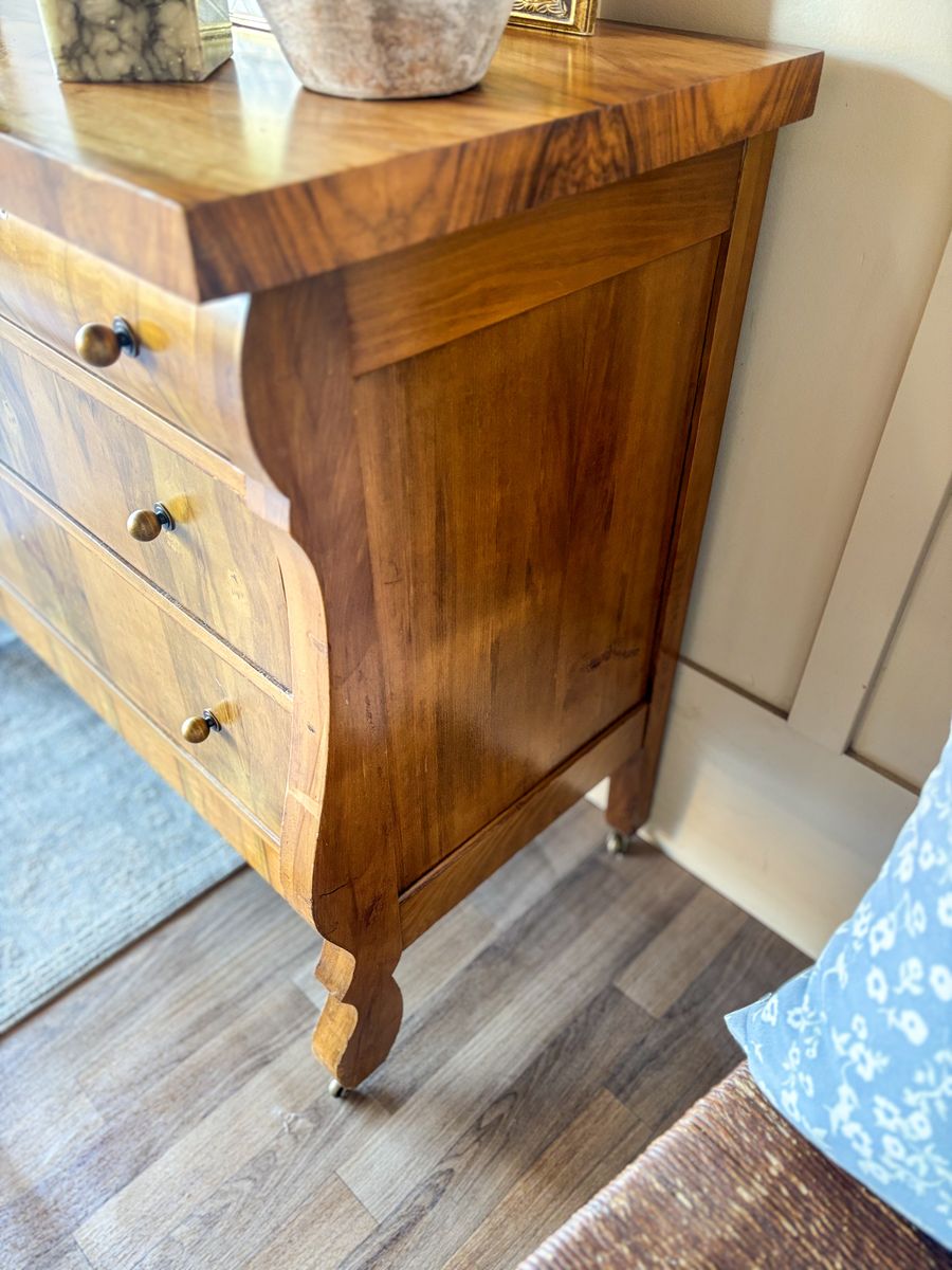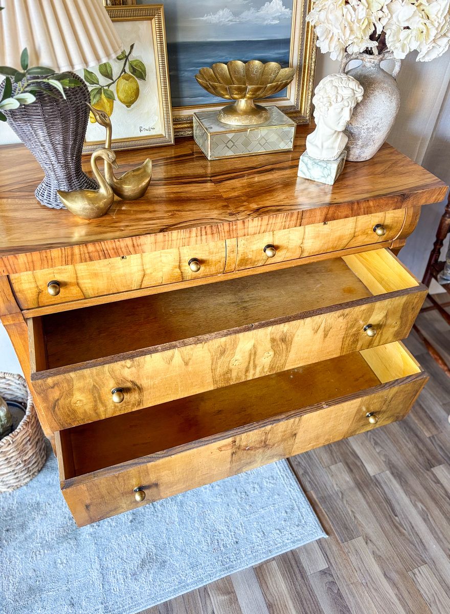 VenmoThis antique flame chest of drawers showcases beautiful movement in the wood grain and timeless character. The top has been refinished and sealed with lacquer for durability, while the body remains in original antique condition with minor wear throughout that reflects its age. The top two drawers have been wallpaper lined and the bottom two remain natural wood inside. It features new antique style hardware and sits on caster wheels, making it both charming and functional. Add drawers open and close with ease. The top two drawers do have locks that work, a skeleton key is included!