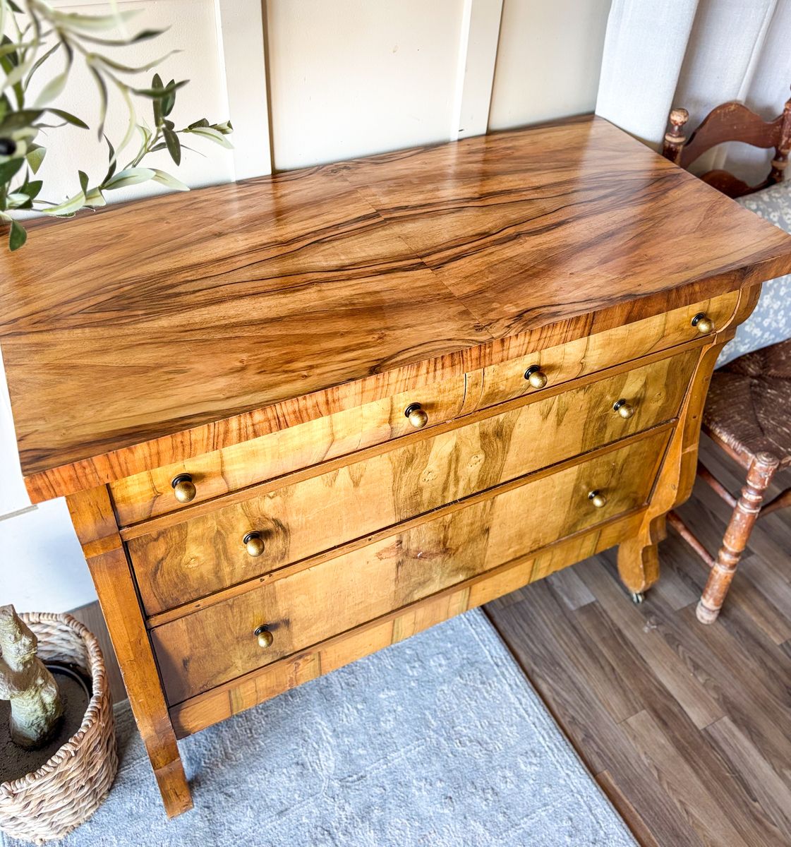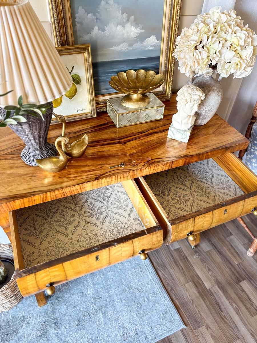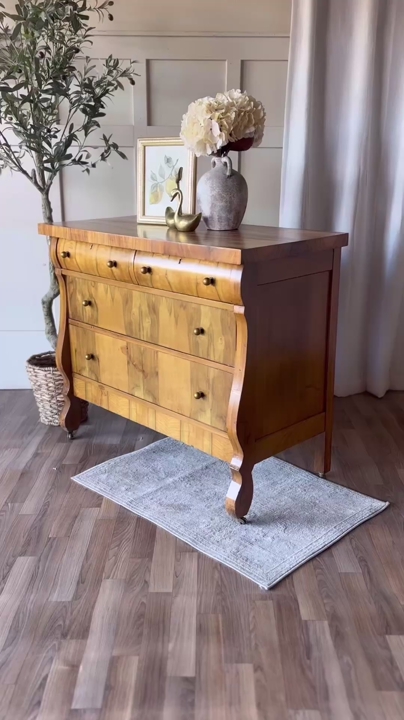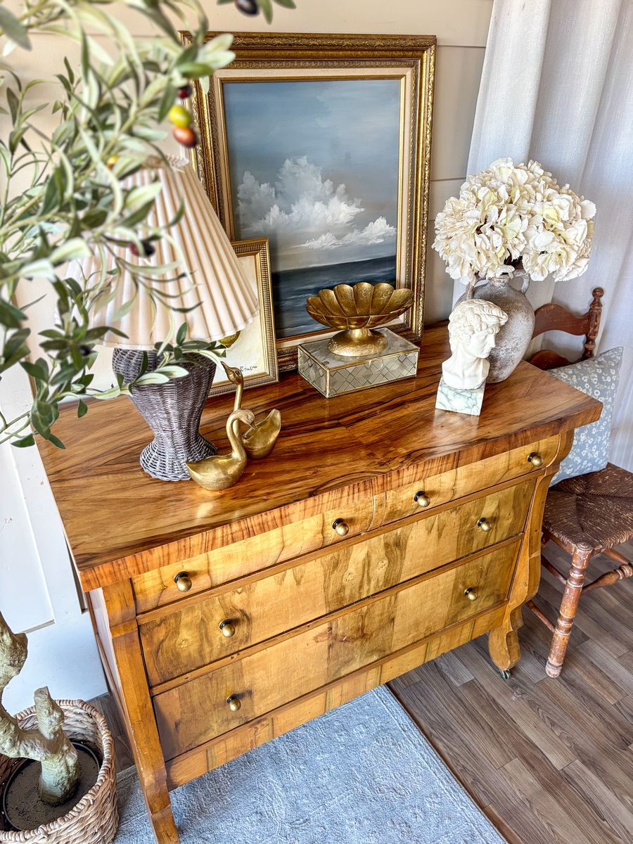 VenmoThis antique flame chest of drawers showcases beautiful movement in the wood grain and timeless character. The top has been refinished and sealed with lacquer for durability, while the body remains in original antique condition with minor wear throughout that reflects its age. The top two drawers have been wallpaper lined and the bottom two remain natural wood inside. It features new antique style hardware and sits on caster wheels, making it both charming and functional. Add drawers open and close with ease. The top two drawers do have locks that work, a skeleton key is included!