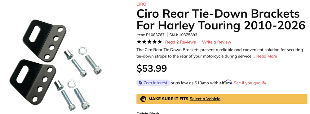 VenmoBrackets front (Road Glide) and rear (all touring) that make tying down a bike easier and more conveneint. Taken off a used Road Glide I purchased. $50 OBO for all. (Rear hardware not inlcluded.)