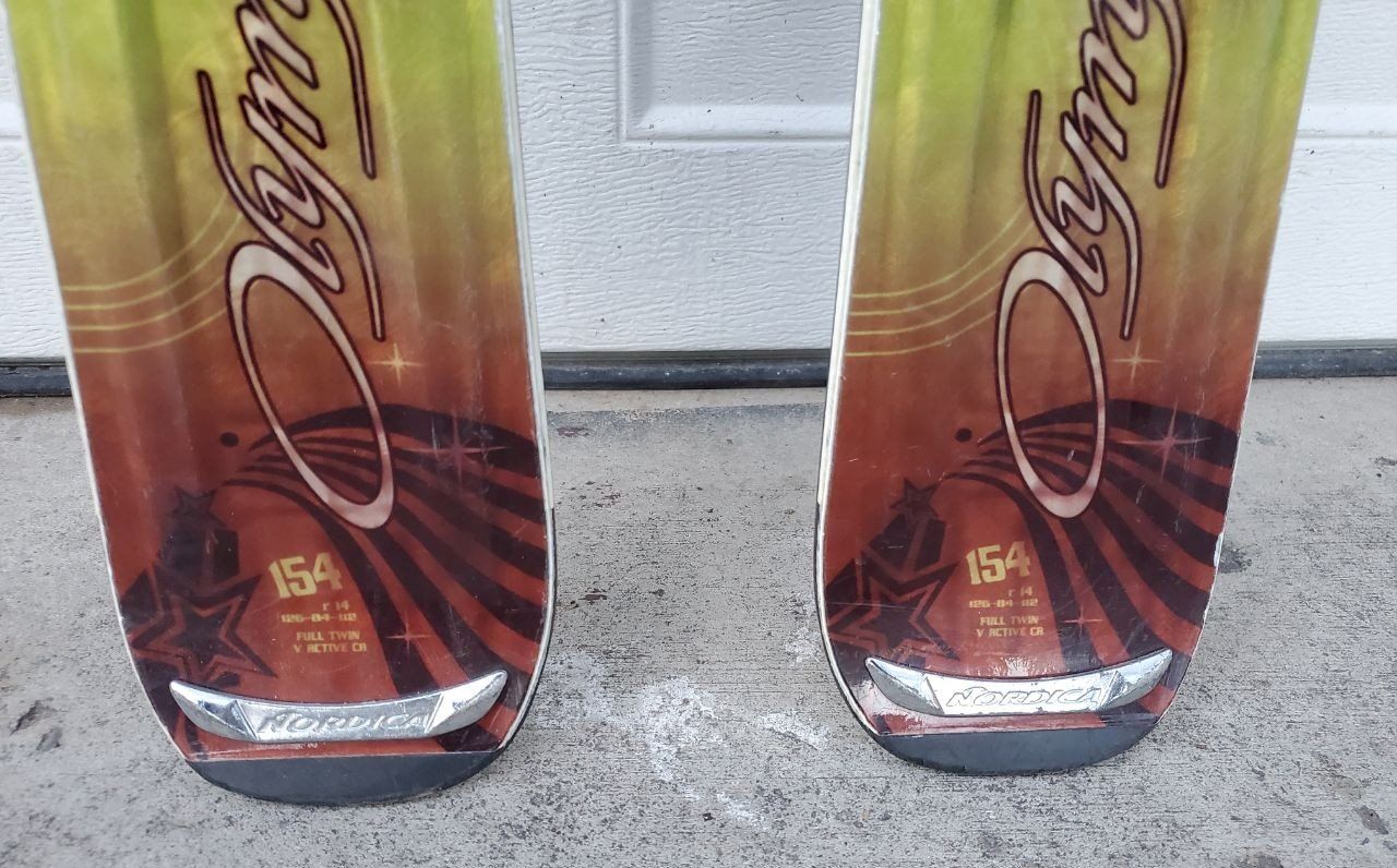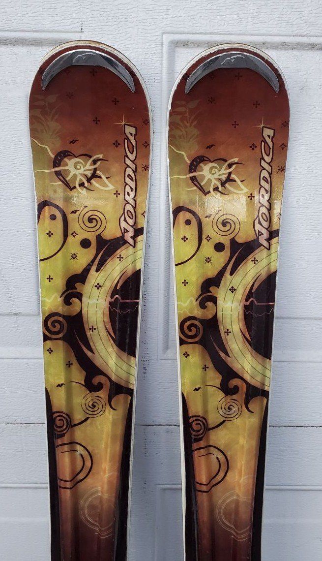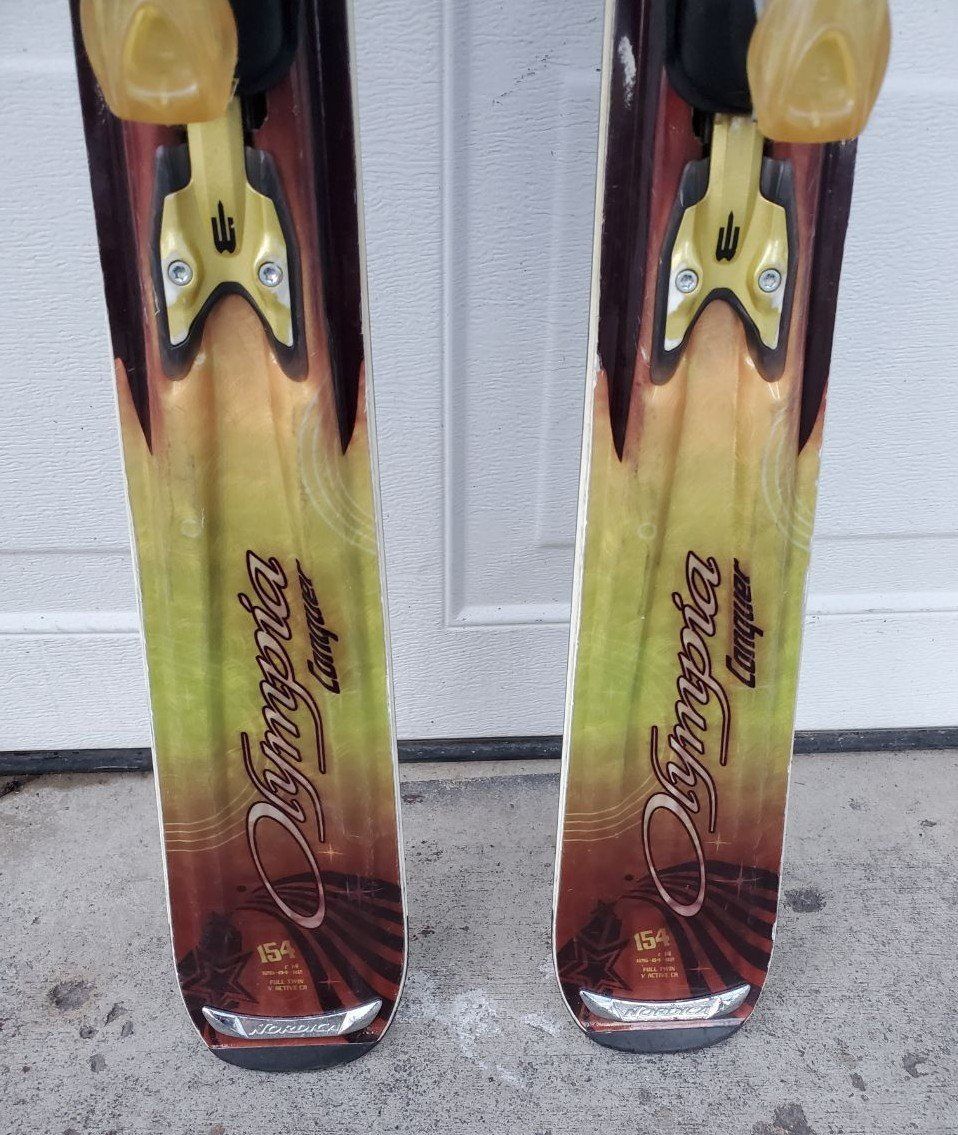154 cm Women's Nordica Olympia Conquer all mountain downhill snow skis with Nordica NPro 25 adjustable bindings. Text me at 385-576-0034 please.