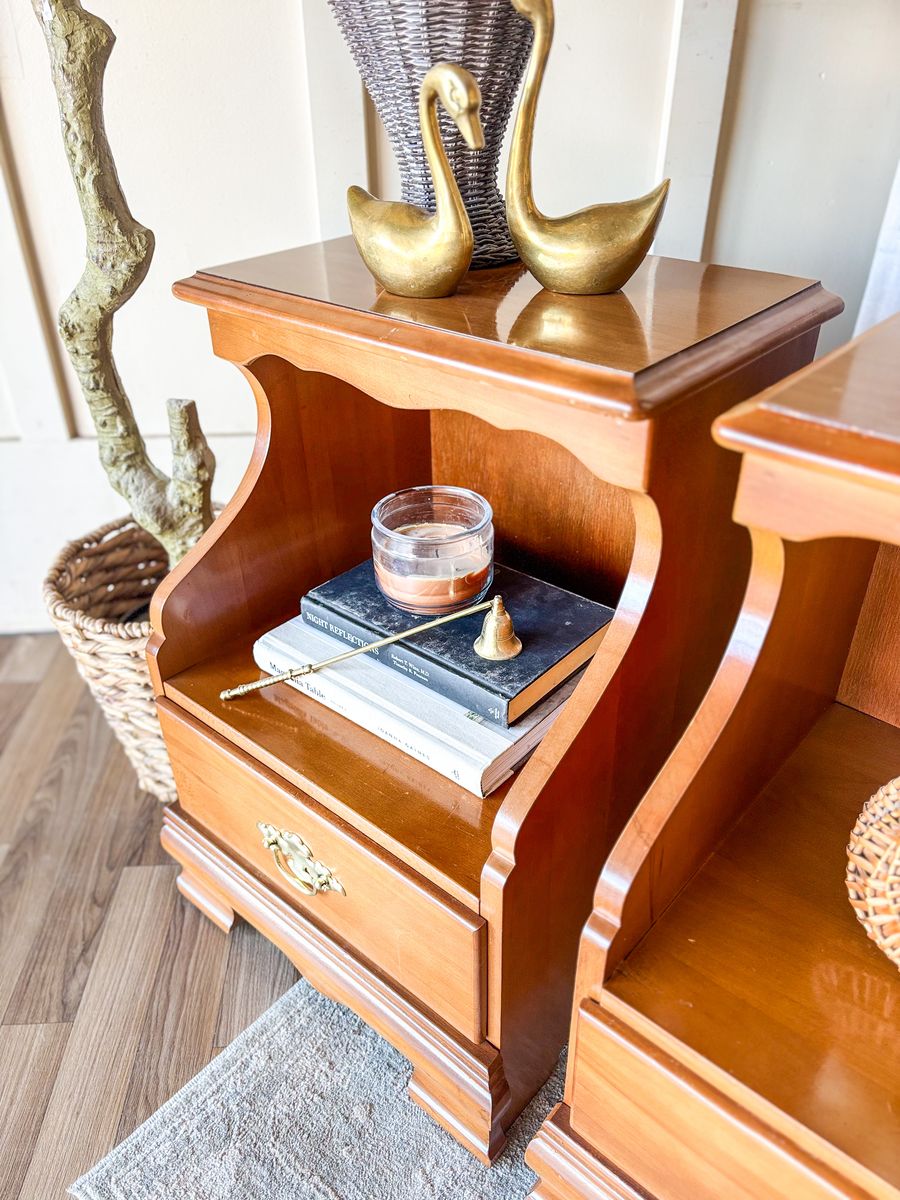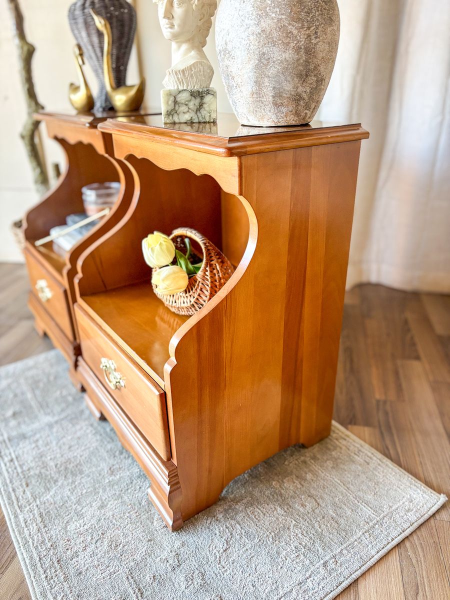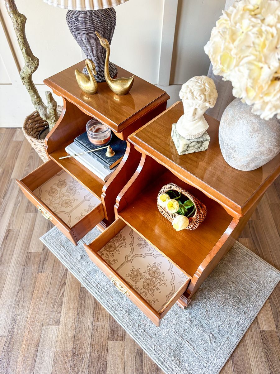 VenmoThese vintage colonial maple nightstands are charming and practical with classic lines and warm tones. Each features one drawer that has been wallpaper lined, and both drawers open and close smoothly. The tops are laminate and fully waterproof, making them durable and easy to maintain. They remain in original condition with original brass hardware and only minor wear consistent with age.