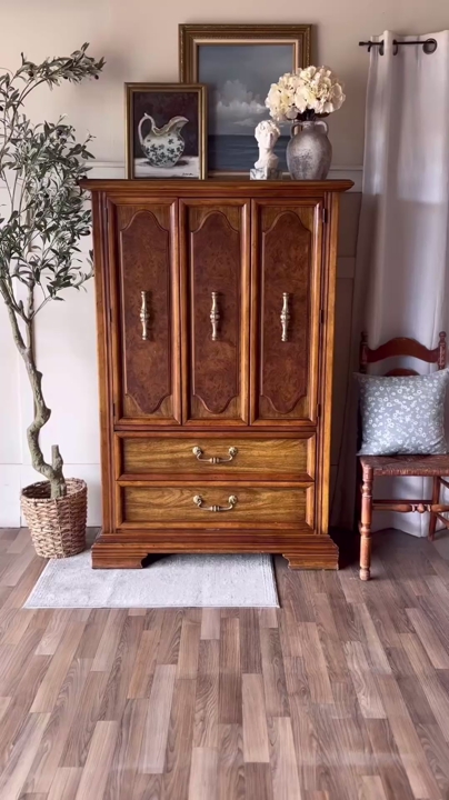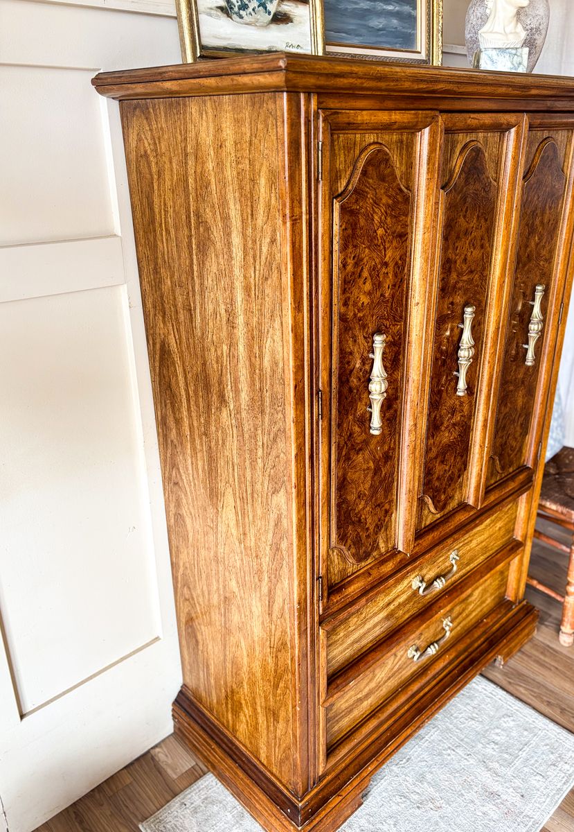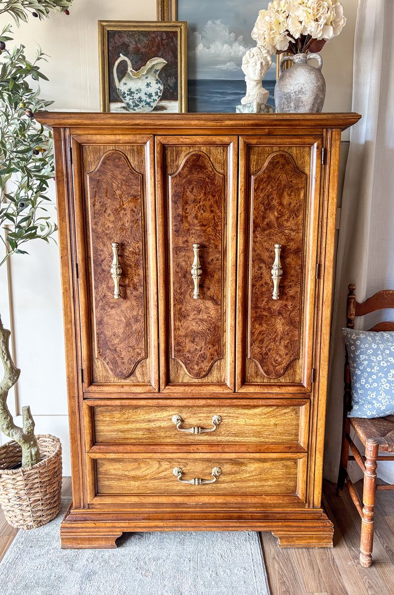 VenmoThis Stanley oak vintage dresser/armoire offers both style and functionality with generous hidden storage. The upper doors open to reveal a shelf and an interior drawer that opens and closes smoothly, while the bottom two drawers also glide with ease. It retains its original brass hardware and remains in original vintage condition with minor wear throughout. This is a solid, well made piece that works beautifully in a bedroom or as additional storage in any space!