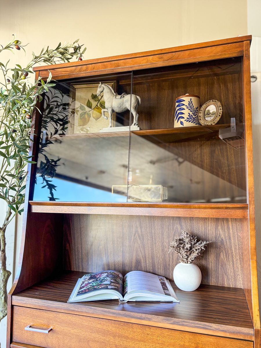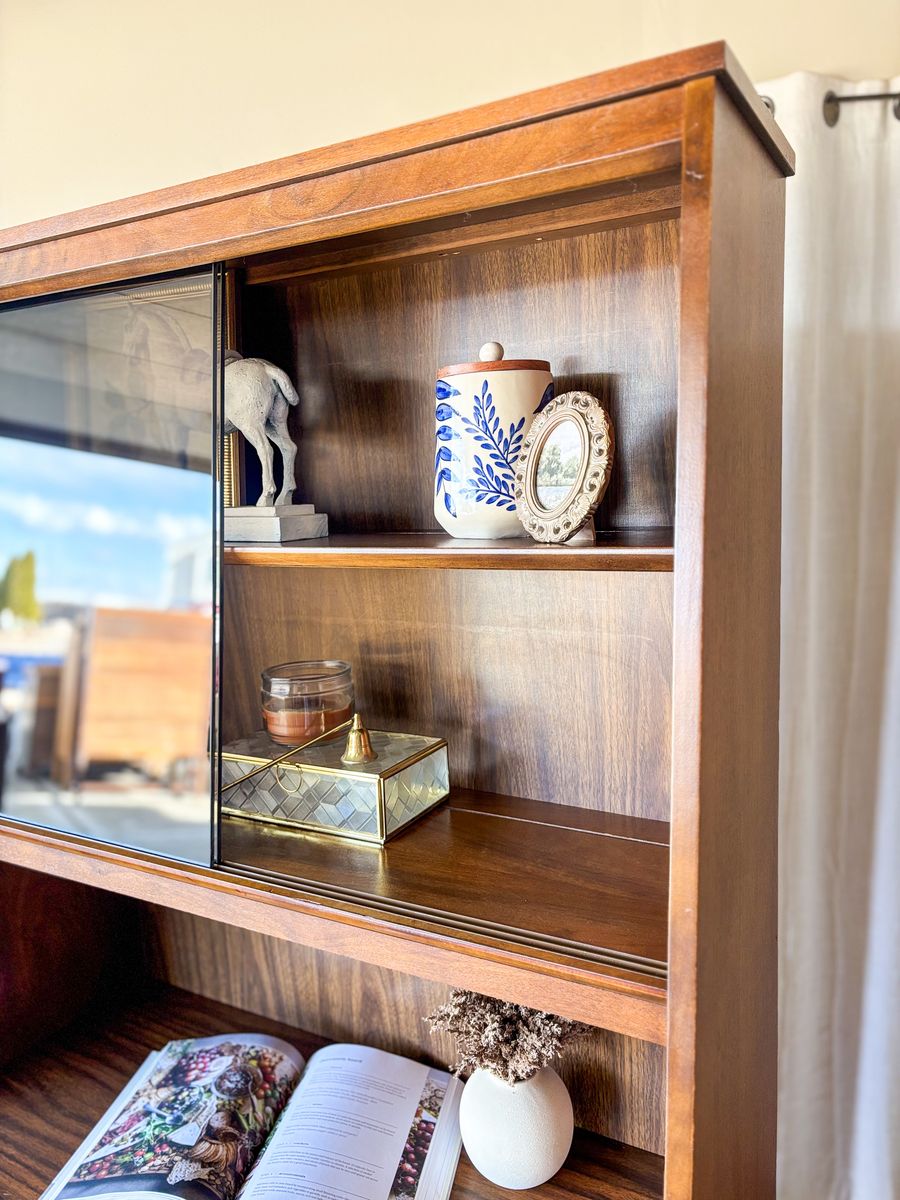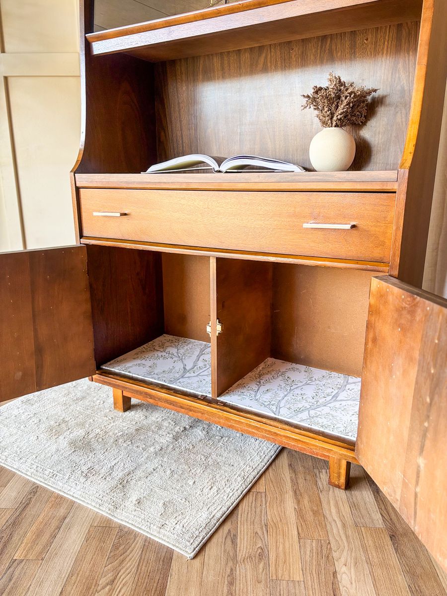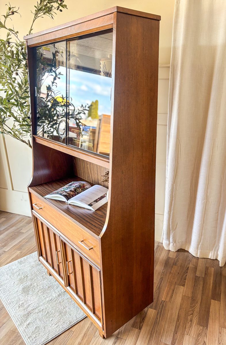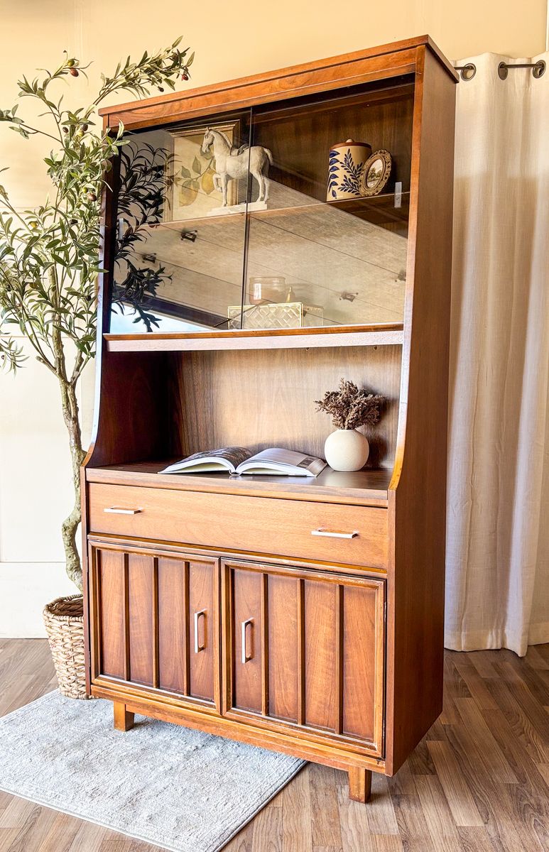 VenmoThis mid century modern walnut bar cabinet is a versatile statement piece that works beautifully as a coffee bar, wet bar, curio cabinet, or display hutch. The smoked glass sliding panels are in excellent condition with no chips or scratches, and the original chrome handles have been polished for a clean finish. The drawer and lower cabinet doors open and close with ease, revealing additional storage with wallpaper lining in the bottom section. The back panel is faux wood, and the piece remains in original vintage condition with some wear that adds to its character!