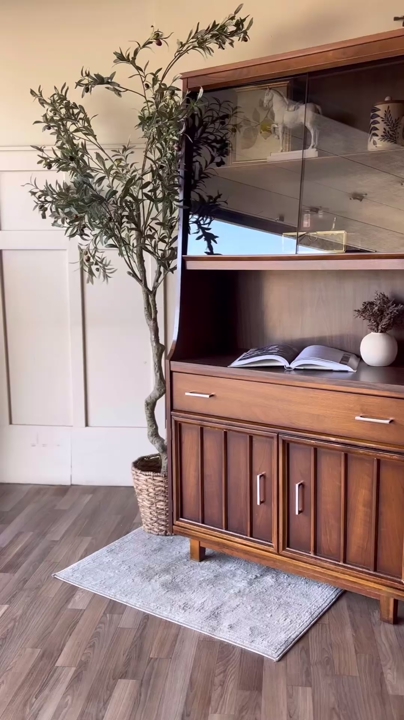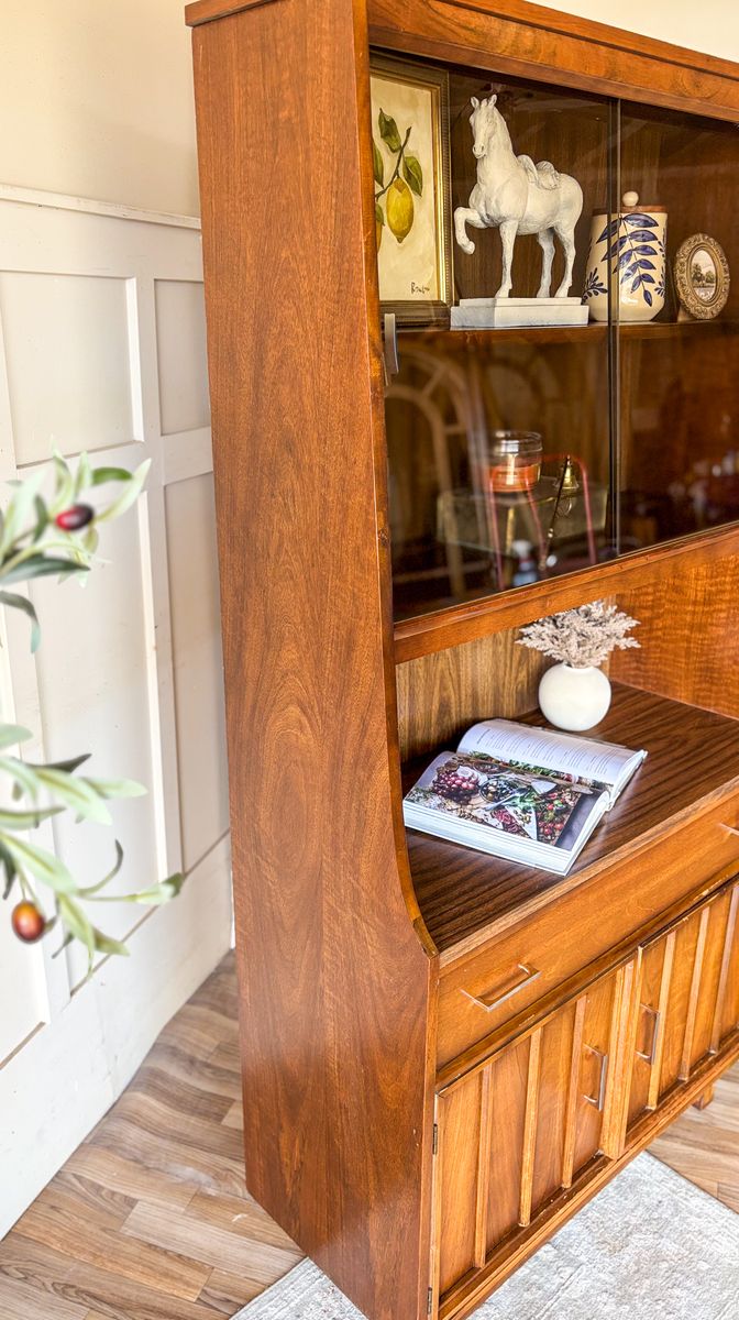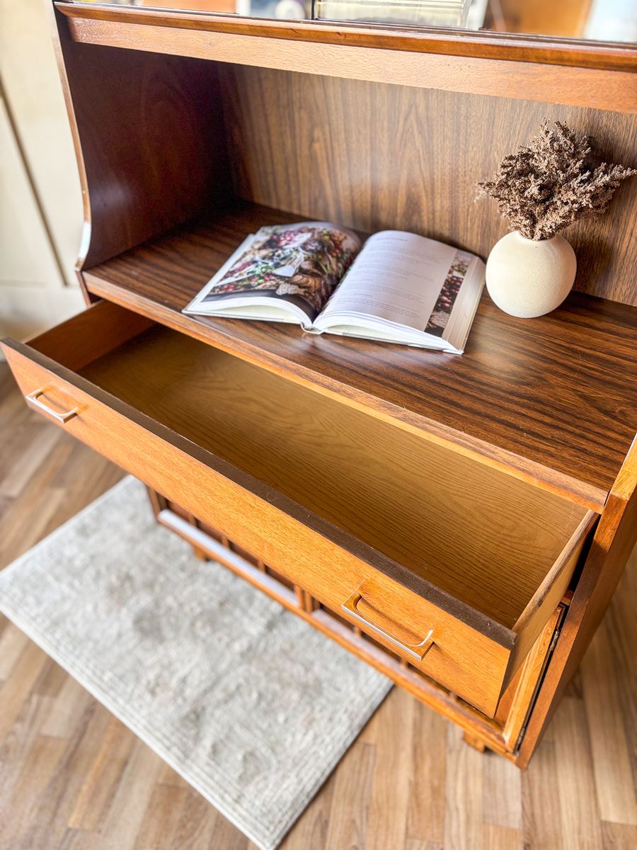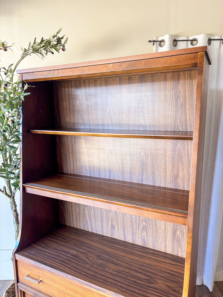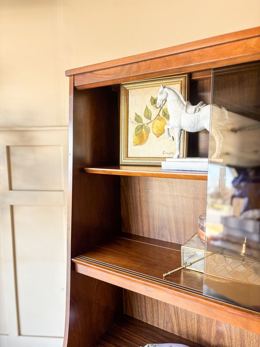 VenmoThis mid century modern walnut bar cabinet is a versatile statement piece that works beautifully as a coffee bar, wet bar, curio cabinet, or display hutch. The smoked glass sliding panels are in excellent condition with no chips or scratches, and the original chrome handles have been polished for a clean finish. The drawer and lower cabinet doors open and close with ease, revealing additional storage with wallpaper lining in the bottom section. The back panel is faux wood, and the piece remains in original vintage condition with some wear that adds to its character!