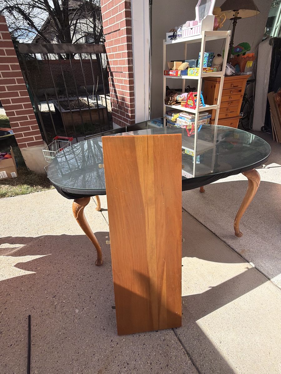 VenmoThis table is solid oak, very sturdy with a glass table topper. It fits 6 people comfortably and with the leaf it can seat 8.