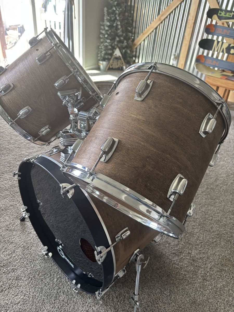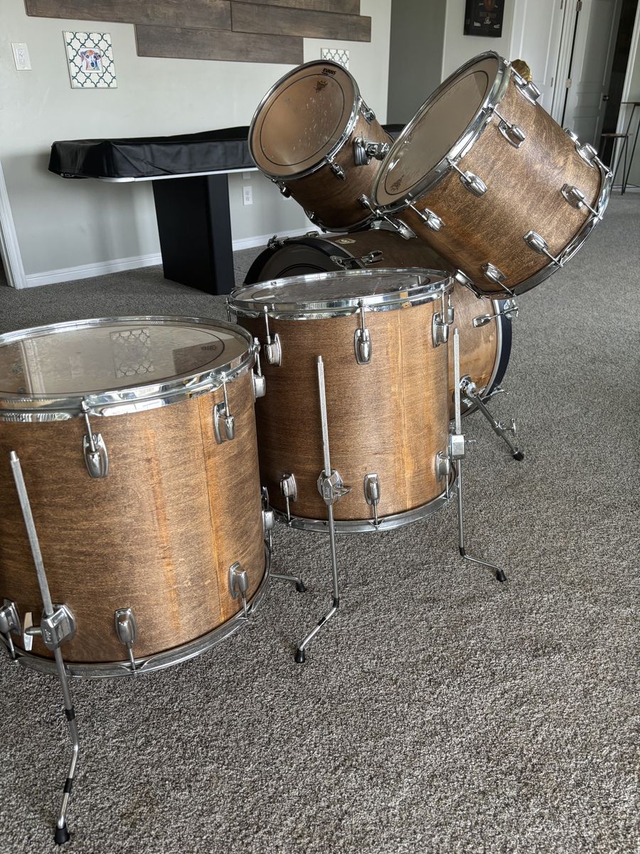 VenmoSelling this monster 80s Ludwig kit. Based on the serial numbers and the badge (black/white), it’s somewhere between 1982 and 1986. It originally had a candy apple red wrap that was cracked and splitting. I took the wrap off and stained the wood the color you see here. It’s gorgeous! Really no flaws on the wood at all. I never played it out or even had it assembled until these pictures. The heads are Remo Pinstripes (lots of life) and the kick is a Remo Powerstroke 3 (lots of life). The sizes are as follows: