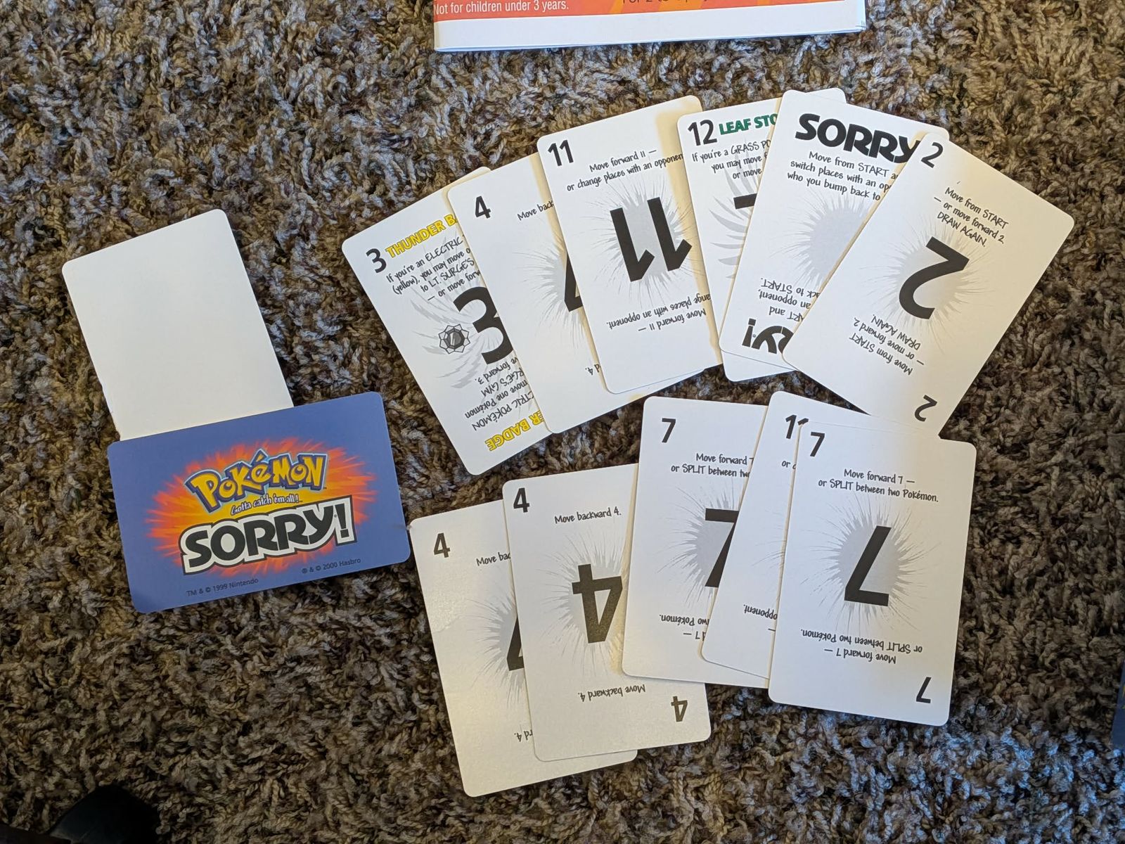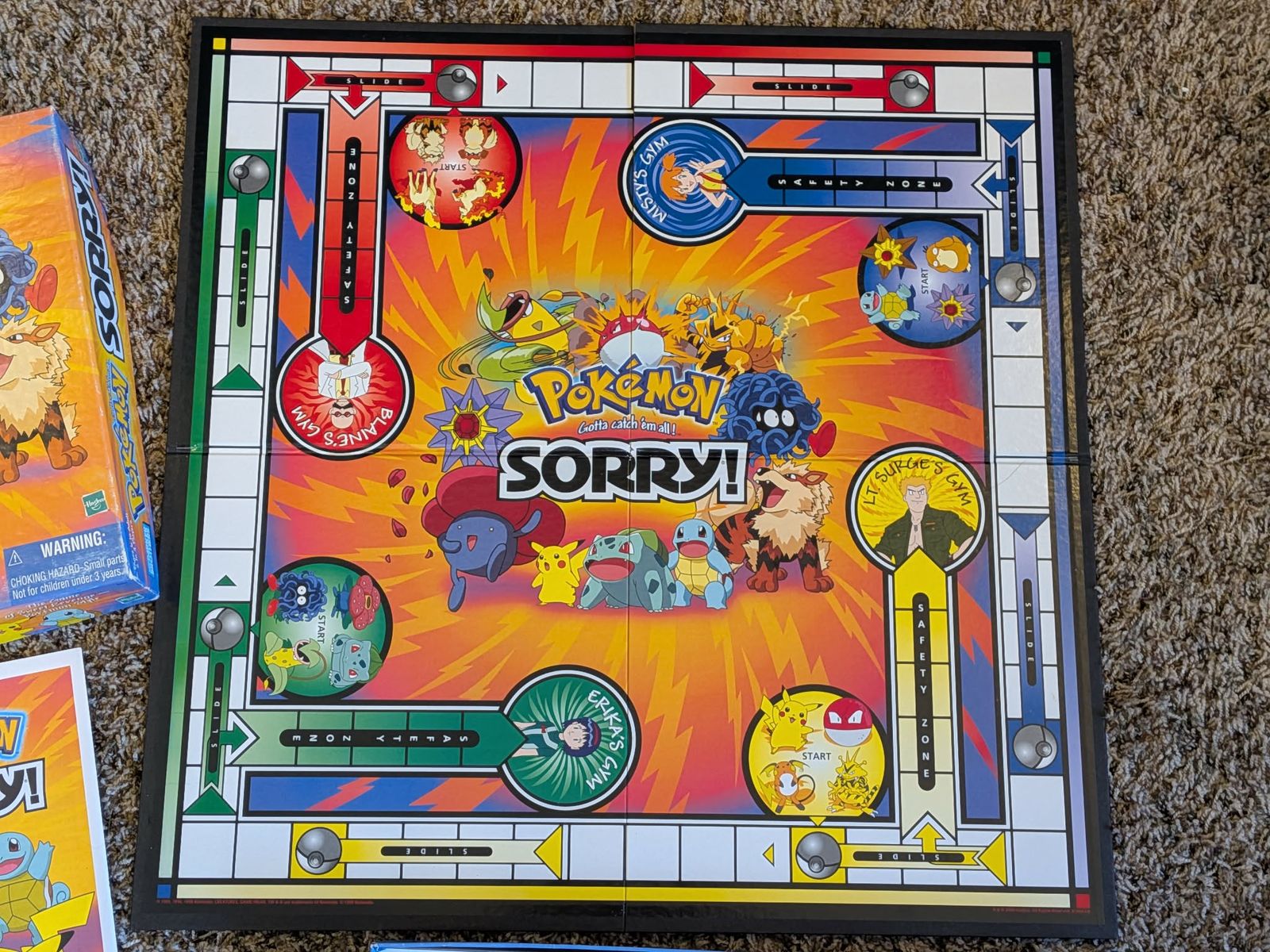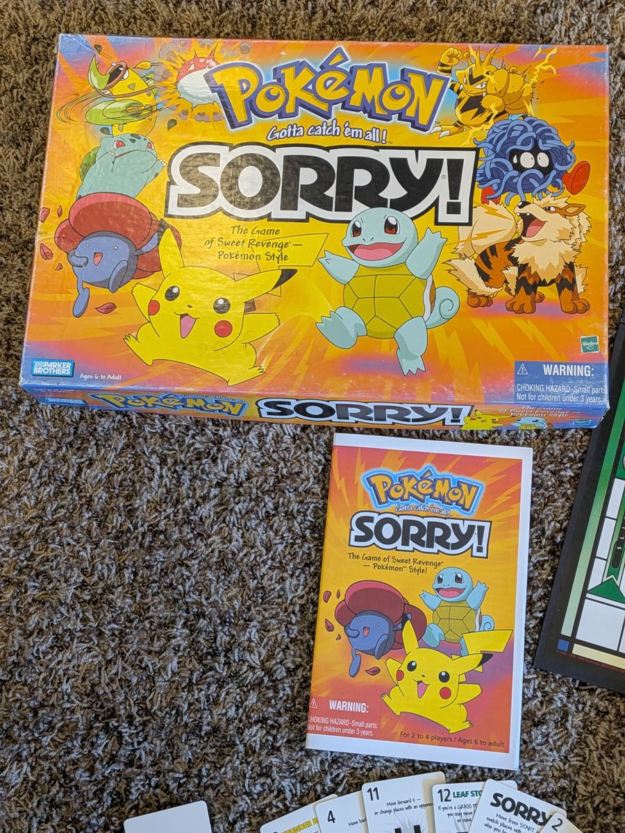 Pokemon Sorry! Board Game Gotta Catch Em All 2000. Game and Box are in great condition- it looks like it has barely been played. Directions are in perfect condition. Missing some cards/pieces. Please see pictures.