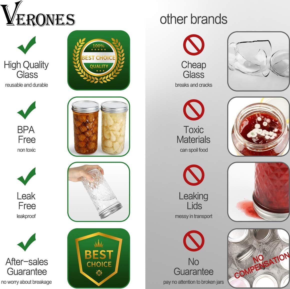 EXCELLENCE IN QUALITY:Thick 22oz VERONES glass jars with food-safe, corrosion resistant lids - material is certified safety standards.Each jar comes with a time tested airtight ceiling compound to held ensure a quality seal with each lid making them suitable for use in preserving and canning. Safe for the refrigerator and the freezer