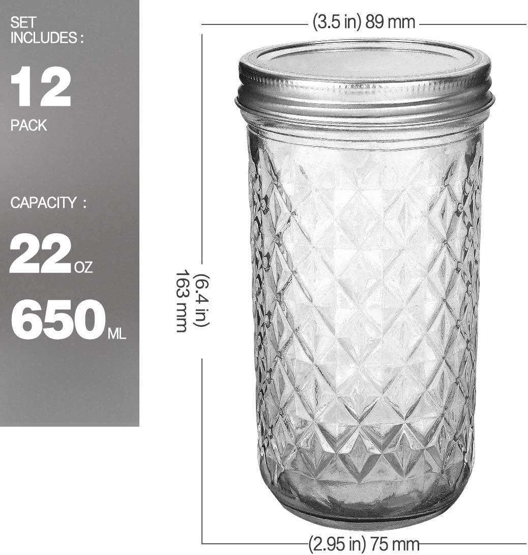 Retailer's Title: VERONES Wide Mouth Mason Jars 22oz, 12 Pack 22 oz Wide Mouth Mason Jars with Lids and Bands, Ideal for Jam, Honey, Wedding Favors, Shower Favors