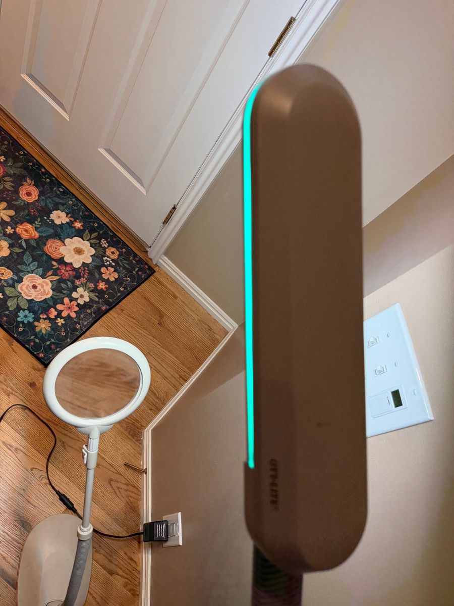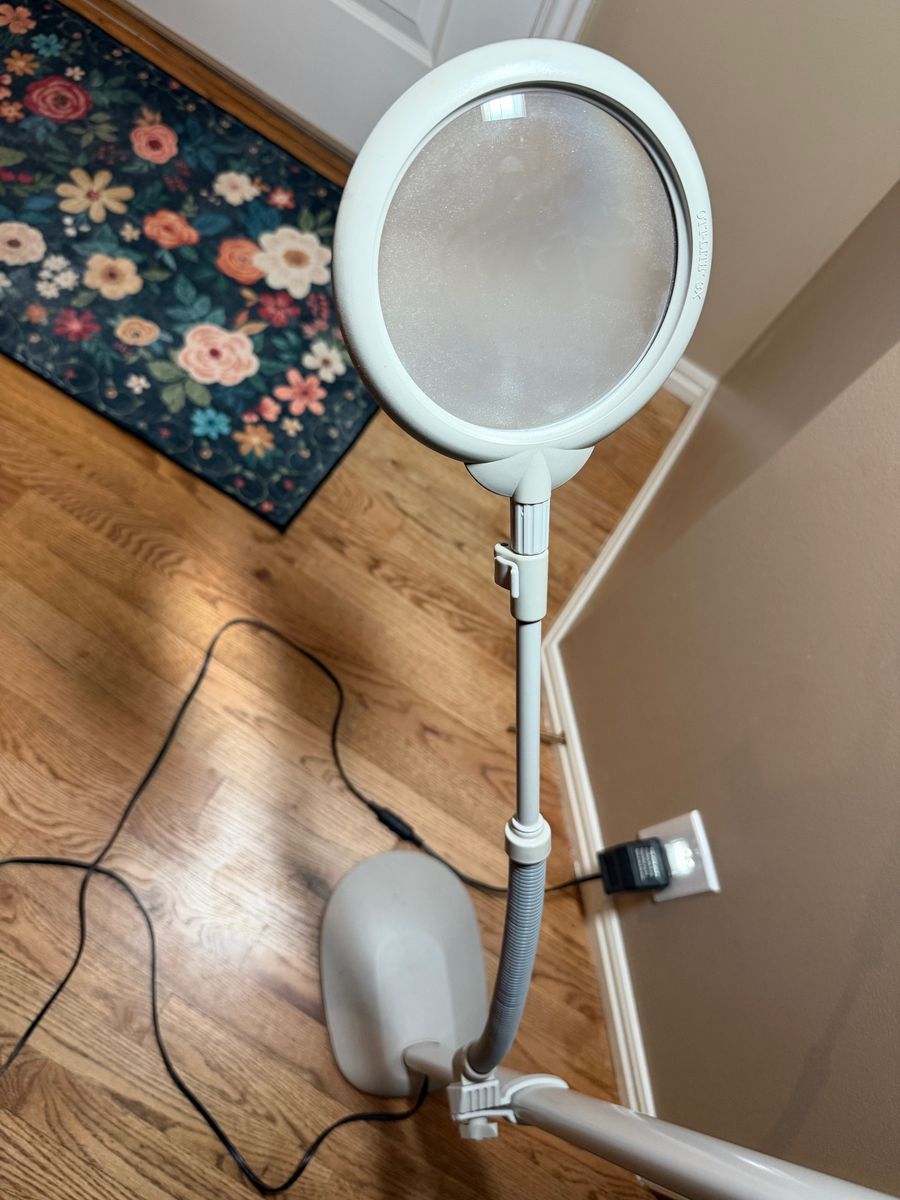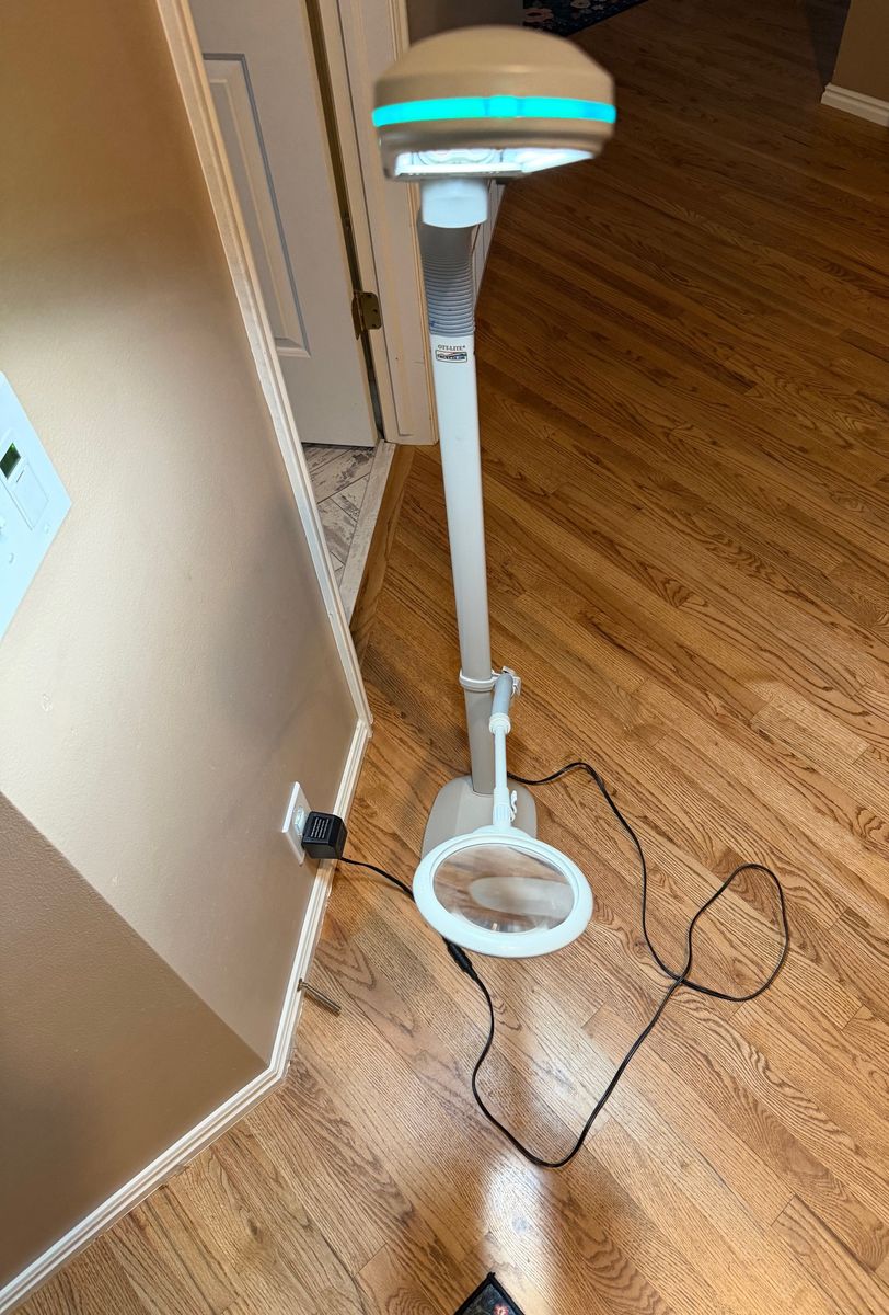 CashAppThe OttLite OLFO18TC is a Wing Shade Floor Lamp designed for crafting, sewing, and task lighting. This white, steel, 18-watt lamp features a flexible gooseneck for adjusting height (approx. 45” to 58”) and a multi-position shade for directing natural daylight illumination, which reduces glare and eye strain.