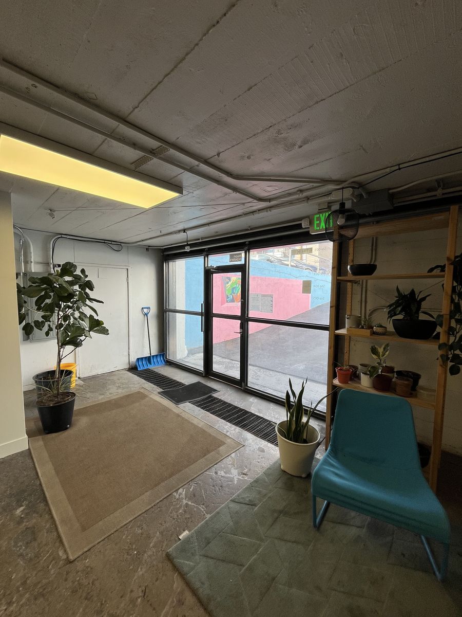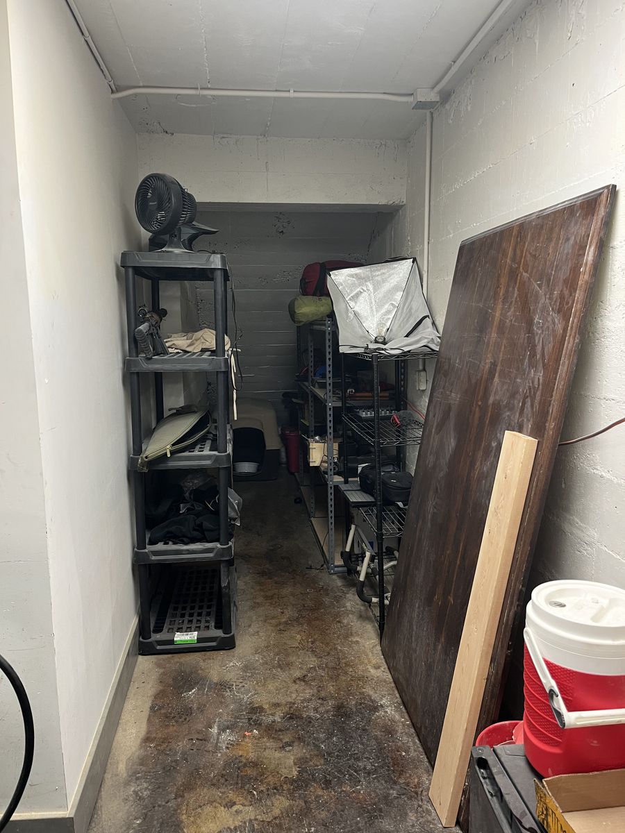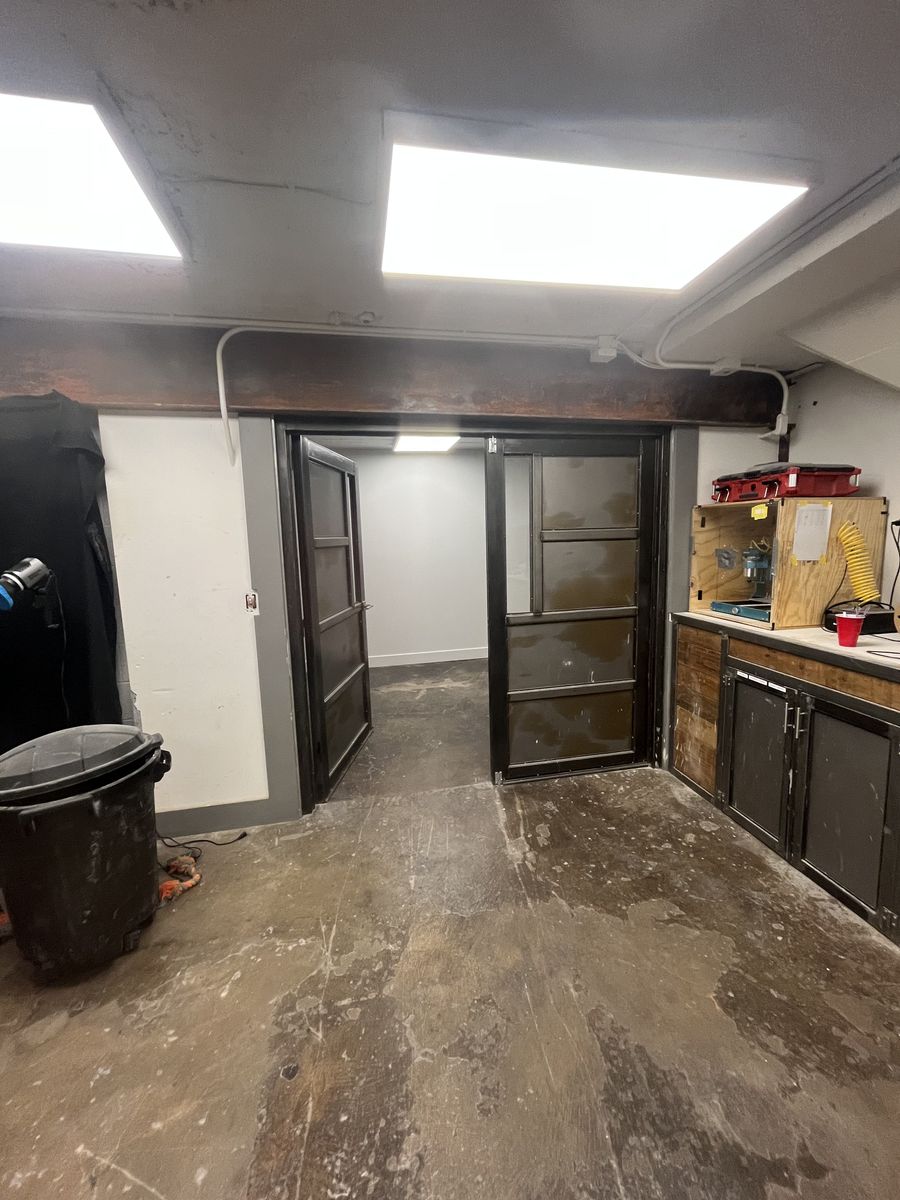 Comes with a built in workbench, custom steel double door, ramp access, 220v power. lots of storage, shared bathrooms, free internet. Please let me know if you would like more info or a tour!