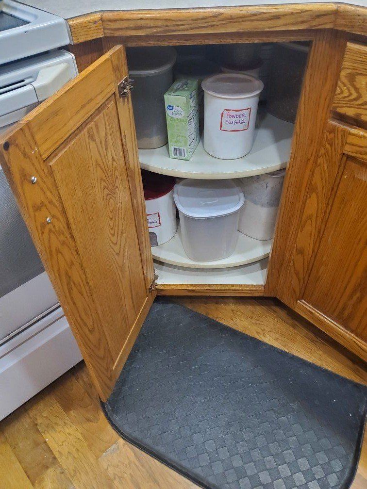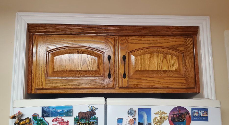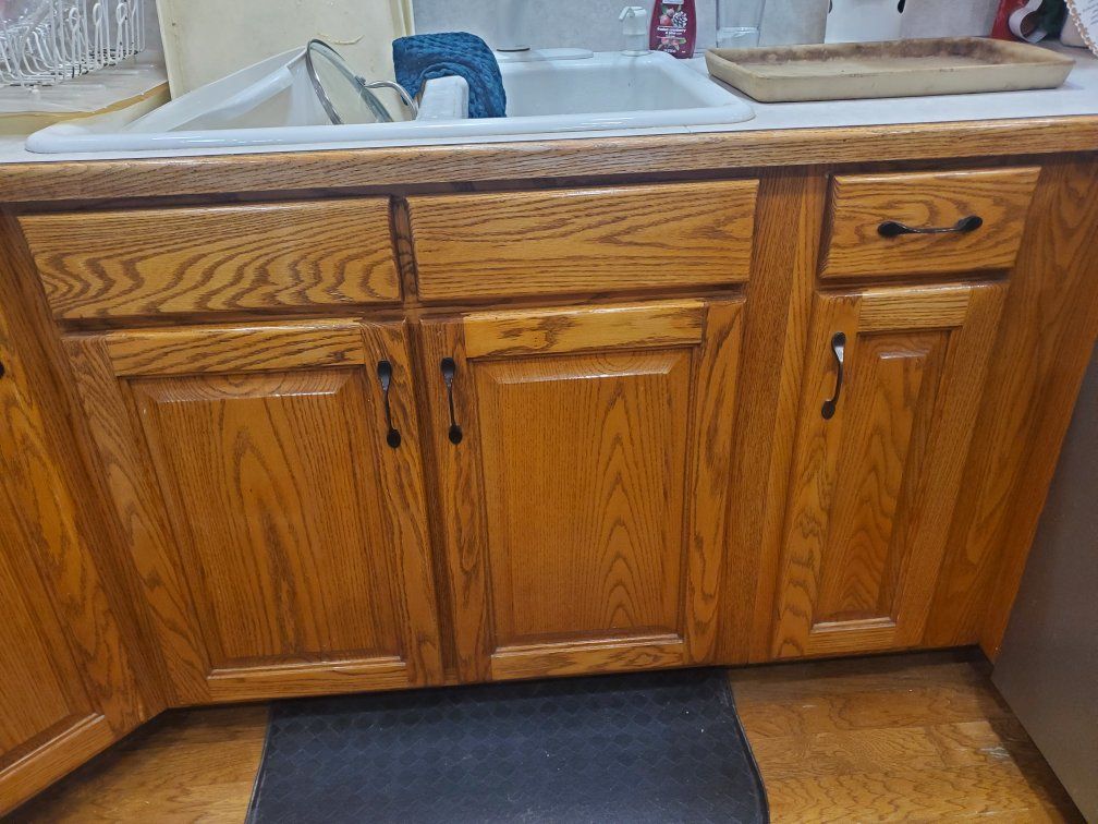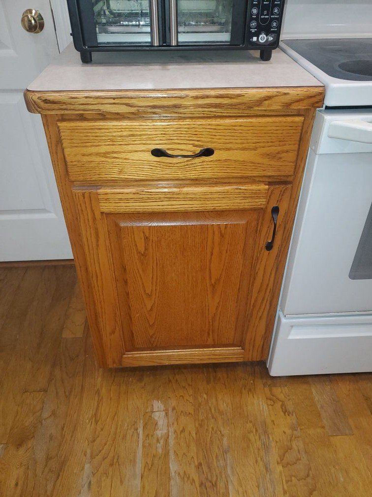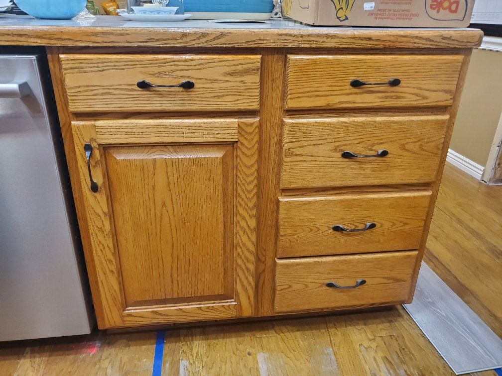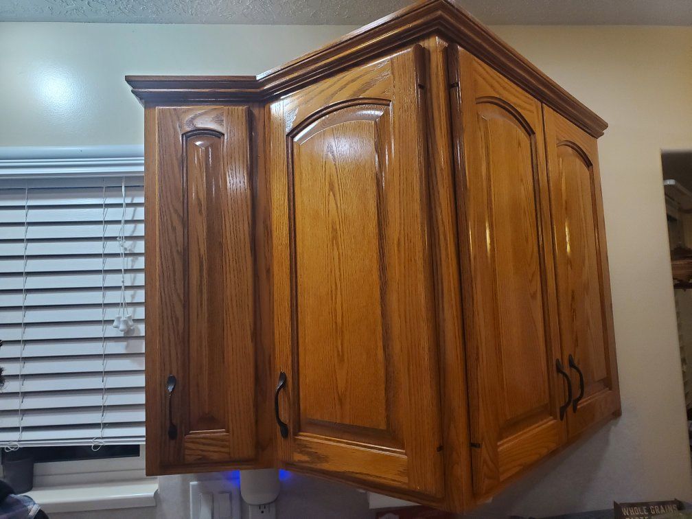 GooglePayIt's kitchen remodel time and the old cabinets are coming out. Installed in 1995 and refinished in 2021. Great condition and need a new home. Cathedral-style kitchen cabinet doors constructed from red oak wood with a golden oak stain. 15 cabinets in all includes: 1 Over the fridge 1 Over the range 6 more upper cabinets include 4 one-door uprights, 1 corner unit and 1 three-door angled unit that jets out over a peninsula. 7 lower cabinets including a corner unit with double turntable, under sink, and 7 total drawers. Also, an optional counter top appliance garage. All units sold together.