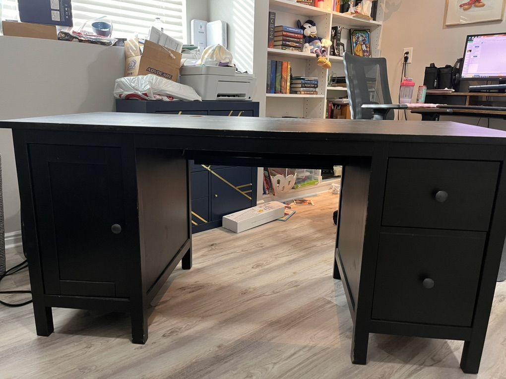 61”L x 25”D x 29”H Cannot deliver, but free if you pick it up. It’s about 12 years old, so it’s got scratches and dents, the cabinet on the left does not have a bottom to it, but both drawers function well. Its still very sturdy to use as a main works space or craft space