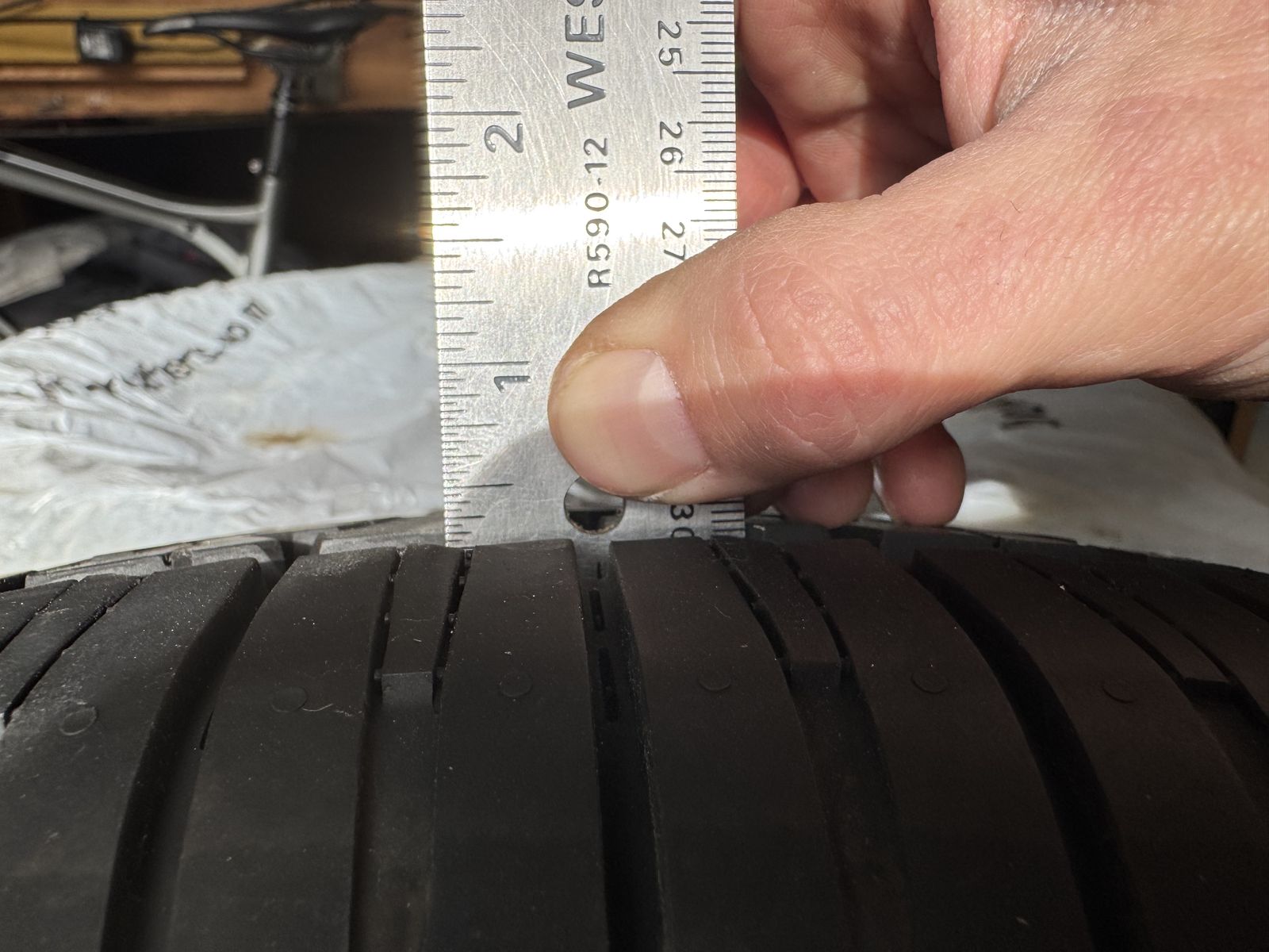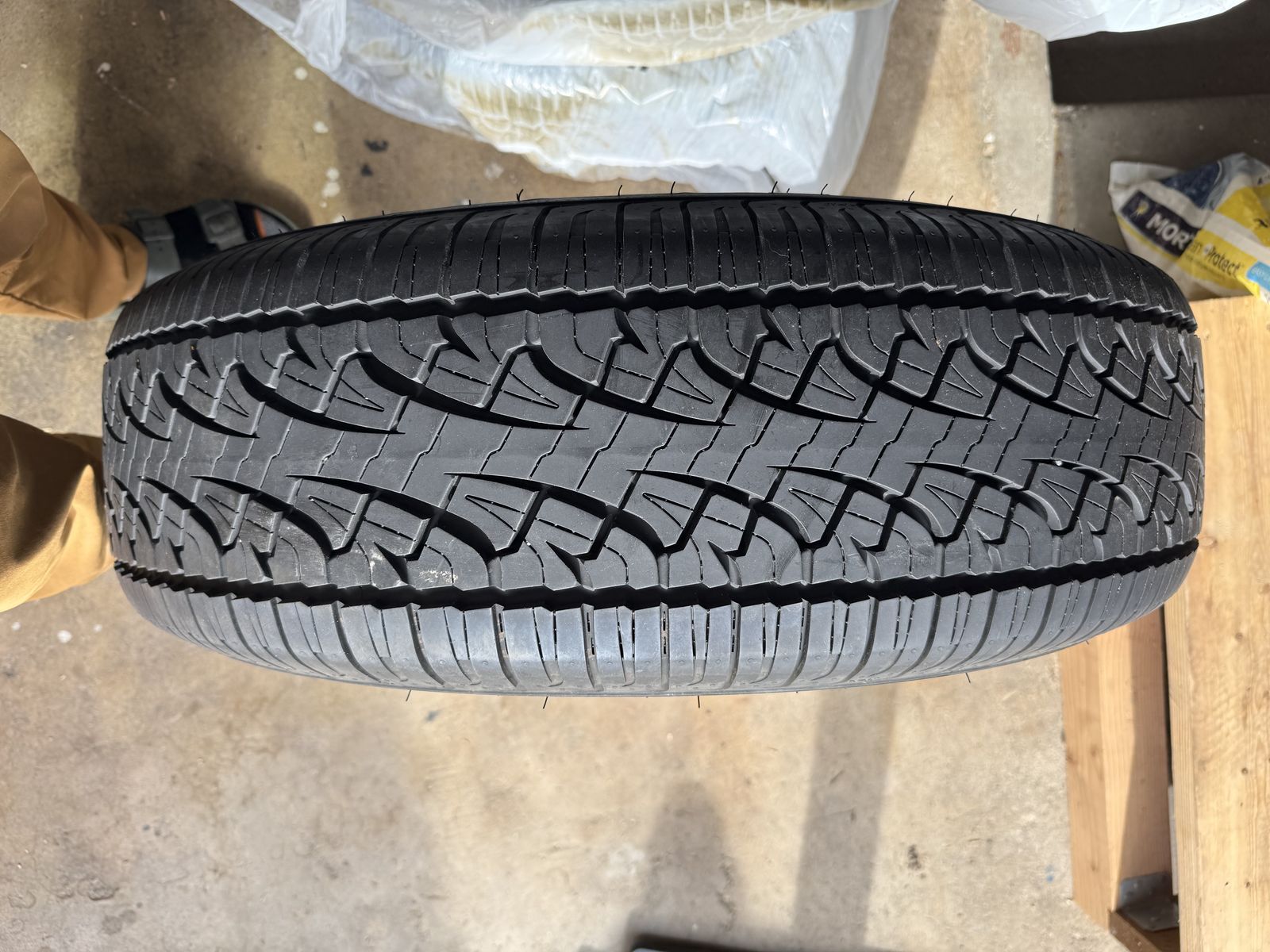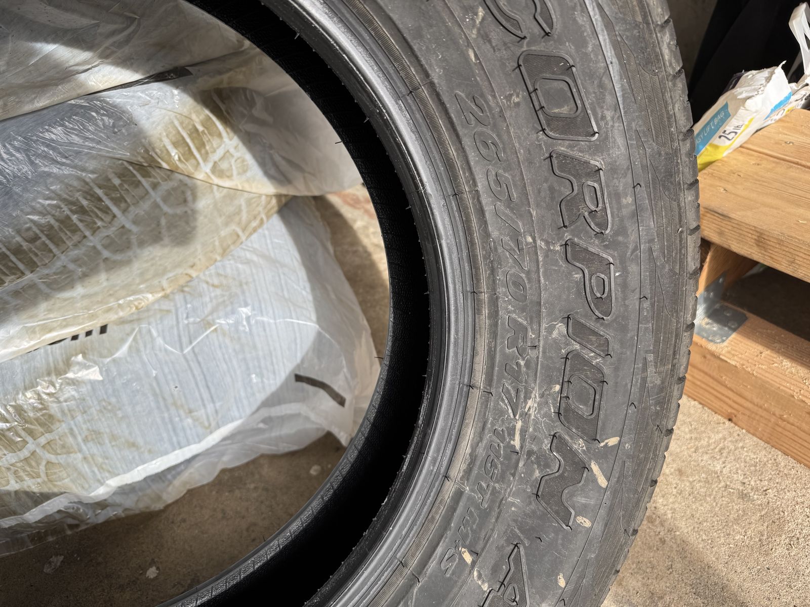 Not exactly sure how many miles are on these but not many. Still smell and feel like new tires and they have been stored in a climate controlled storage unit in the tire bags. I measure about 11/32” of tread, discount tire says new they have 12/32”. I currently have them on my work truck and they are great in snow, mud, rain and on the highway. Message with questions or for more details.