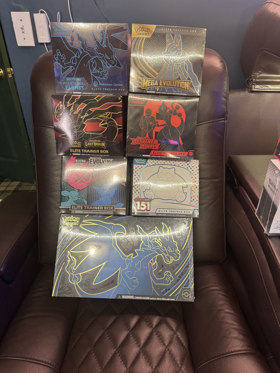 Feel free to ask for photos. Selling as a collection. Not taking offers, listed price is the lowest I’m willing to take. List of Sealed stuff in collection: 1x Evolving skies ETB 1x 151 ETB 1x Crown Zenith ETB 1x Fusion Strike ETB 1x Silver Tempest ETB 1x Lost Origin ETB 2x Charizard UPC 2x Pokemon Center Phqntasmal Flames ETB 3x Mega Evolutions ETB 1x Destined Rivals ETB 1x Surging Sparks ETB 2x Prismatic evolutions Costco Bundle 1x Prismatic Evolutions ETB 1x Phantasmal Flames ETB 1x Twilight Masquerade ETB