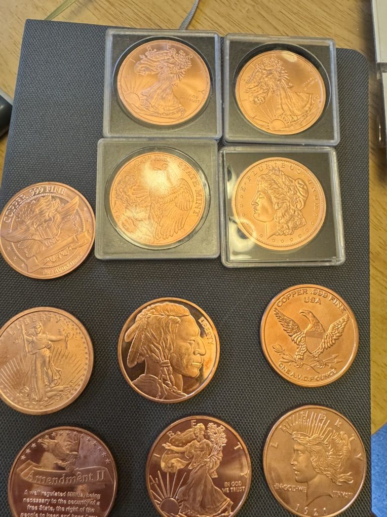 Venmo11 copper rounds, with varying fronts. Morgan, liberty, buffalo, prospector, Statue of Liberty and 2nd amendment. Coloring is from Bad lighting.