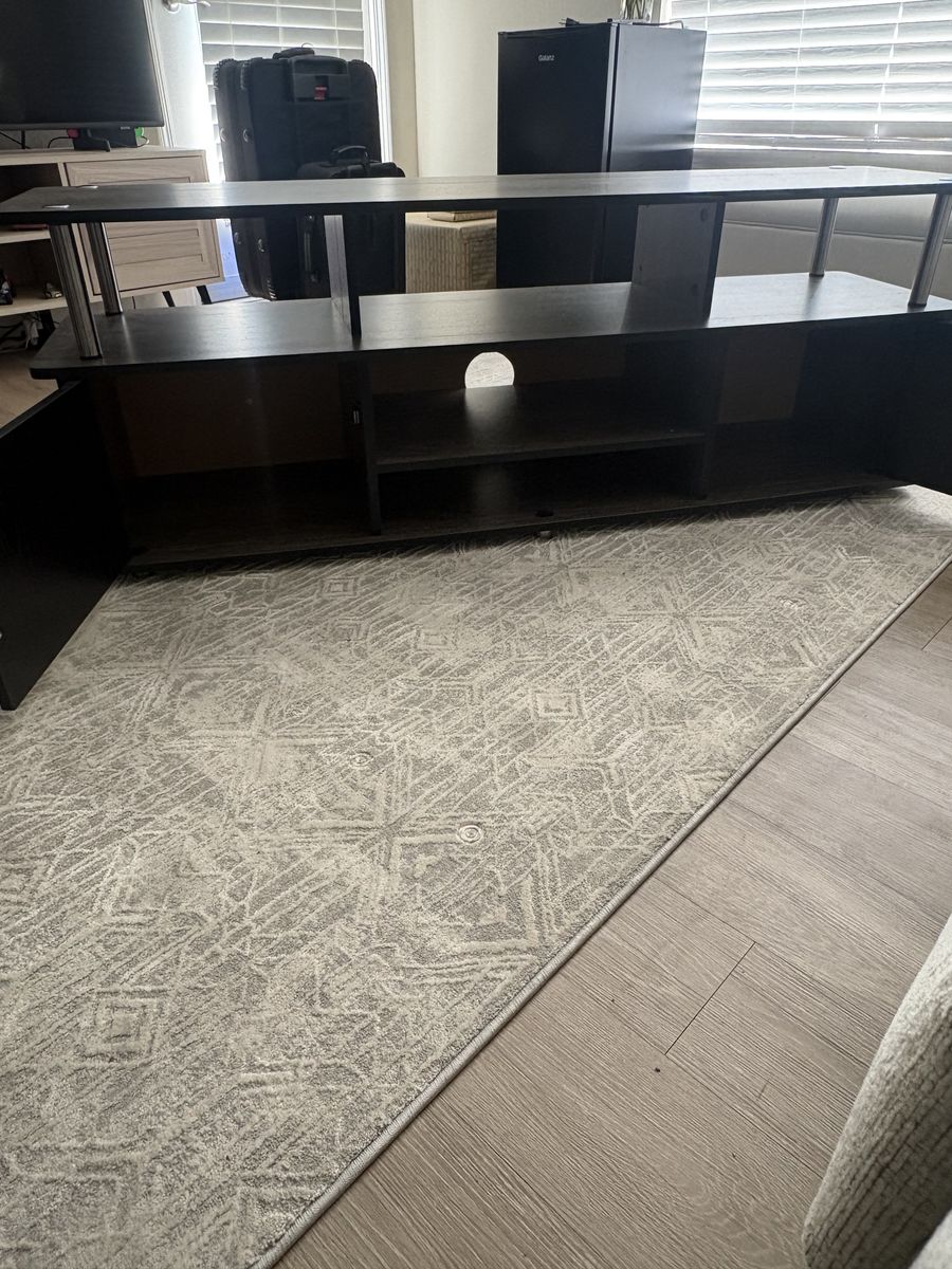 VenmoBarely used, nice, no scrape, clean 60 TV Stand, Media Storage with 3 Open Shelves & 2 Enclosed Cabinets, 60×15.5x24, Weathered Gray/Black Finish