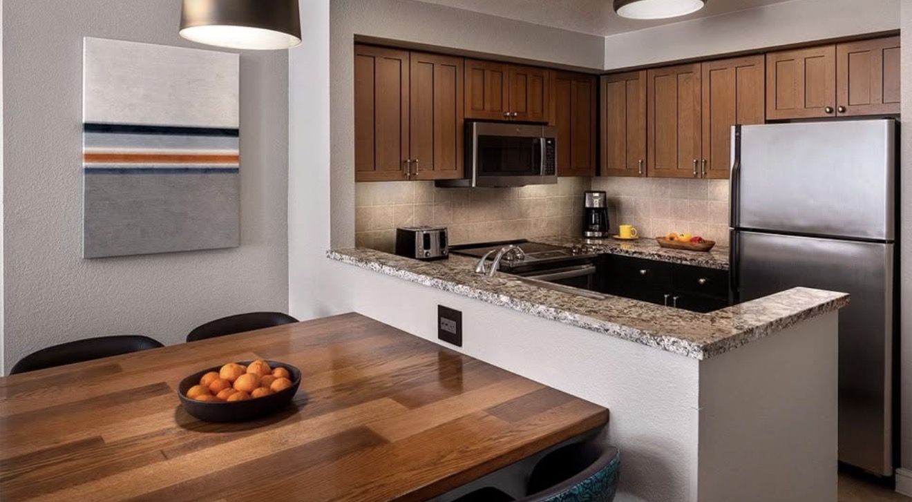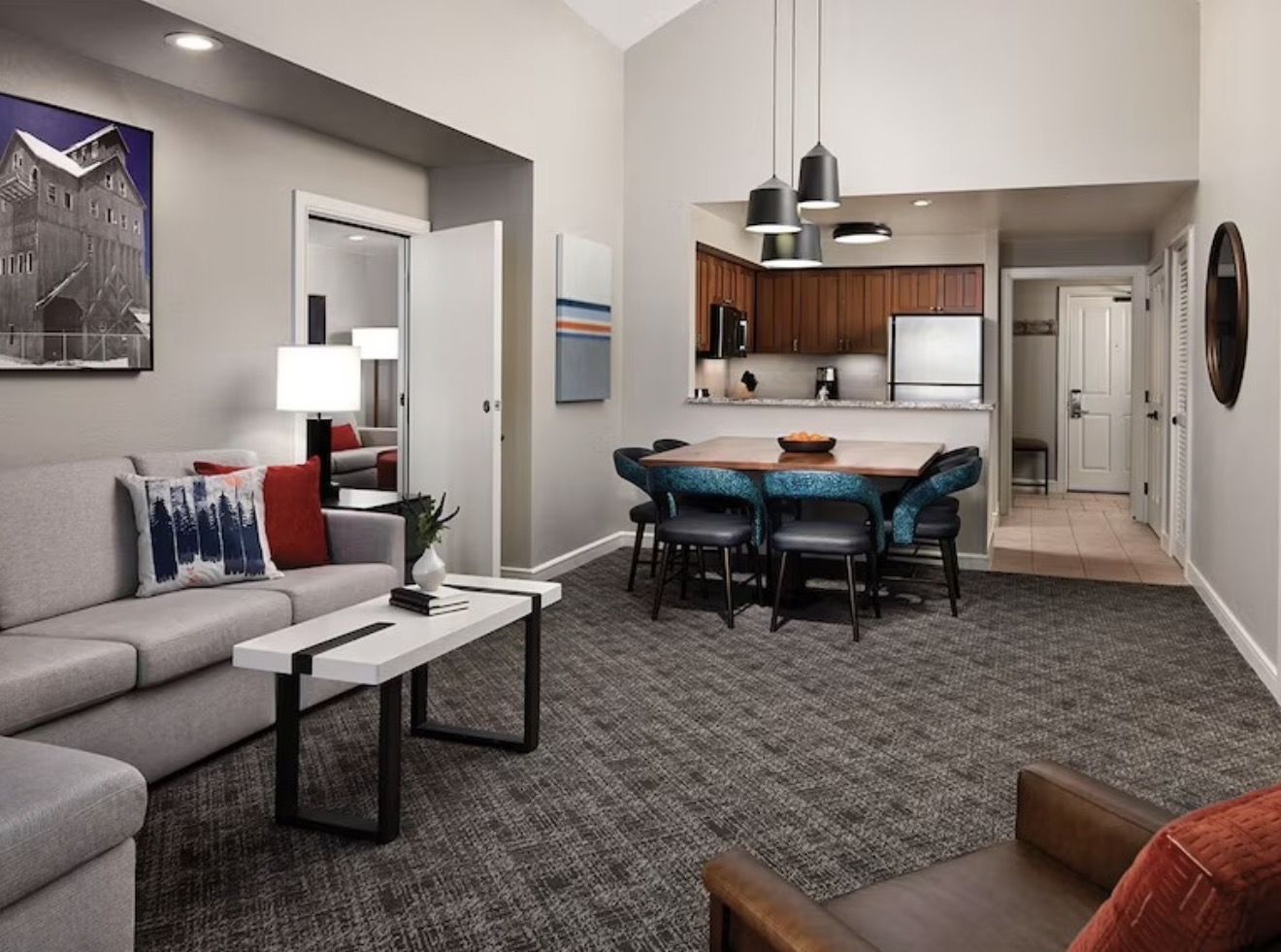 Unit includes 2 bedrooms with living room, dining area, and kitchen. Sleeps up to 6 guests.