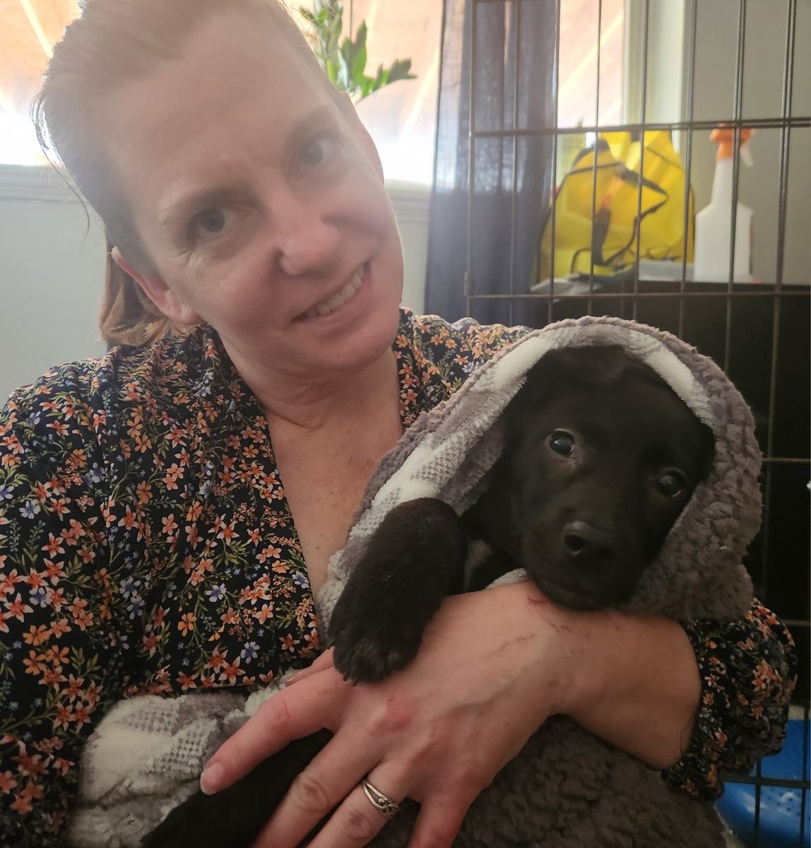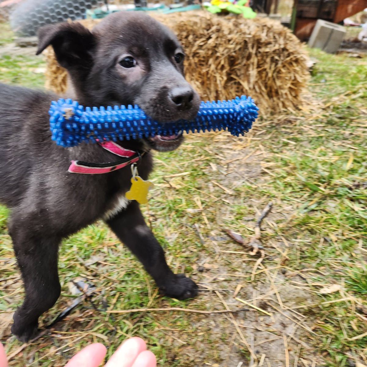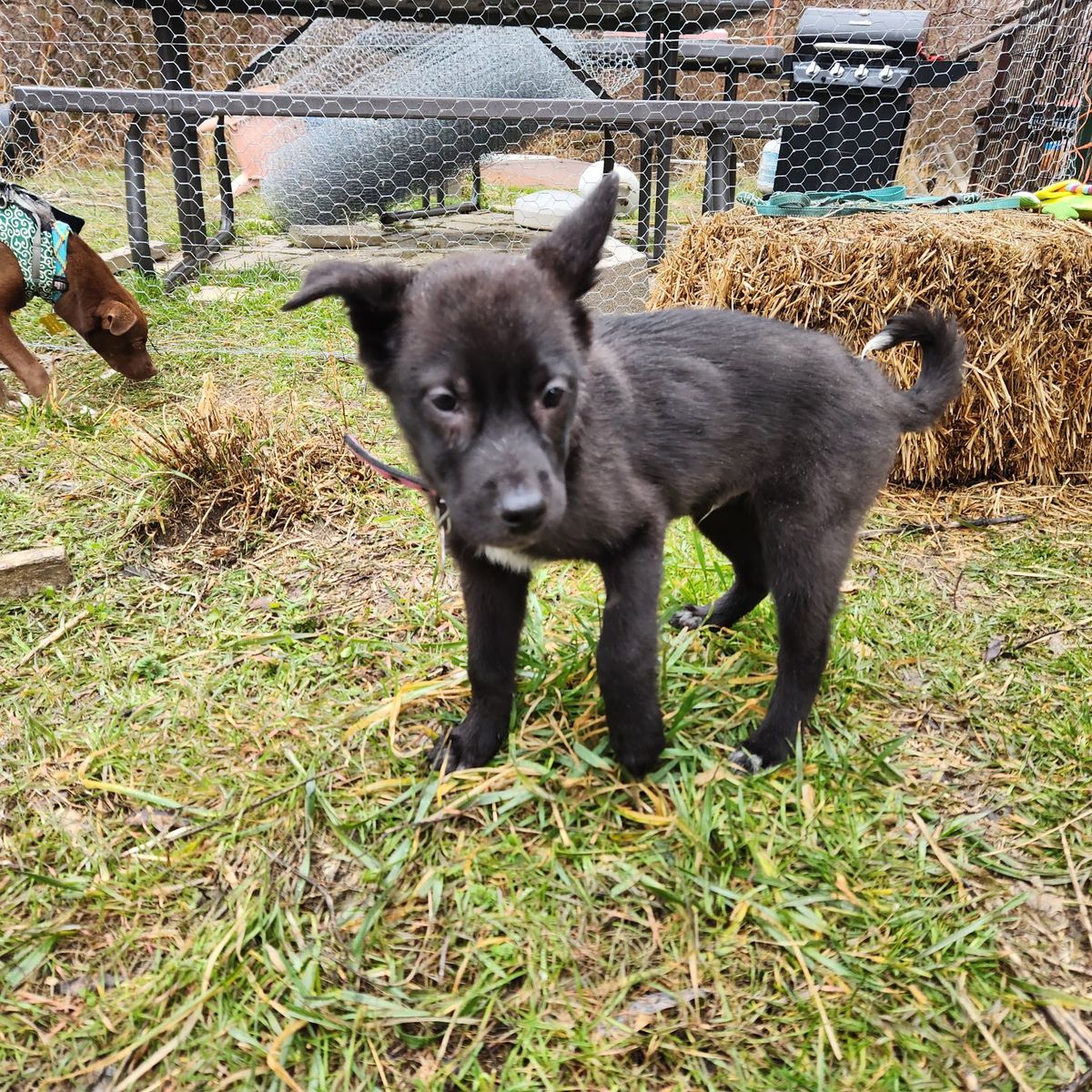 Stark is pure puppy love. His fluffy black coat is made for comfort, and he will adopt anyone and shower them with snuggles and kisses. He is always hungry and is starting to chew the furniture so lots of toys is a must. He trots along with his foster sister, but wants to be carried on the way home. As a typical toddler, he bursts with energy to run, wrestle, play, and jump and then passes out for a nap wherever he lands. •3 months old •neutered, vacc up to date •working on house and crate training and almost has "sit" figured out •pretty good with fetch •good with dogs, cats, kids •afraid of all the farm animals (they're scary when you are a little fluffball) He will adopt his new family immediatly. He jumps and licks so controlled intro to young children. He is a frequent pee-er, but will use the puppy pad if it is close (he went in his food bowl yesterday) He will be a high energy and intelligent dog and might start herding your kids if he gets bored.