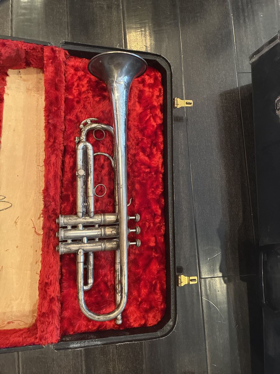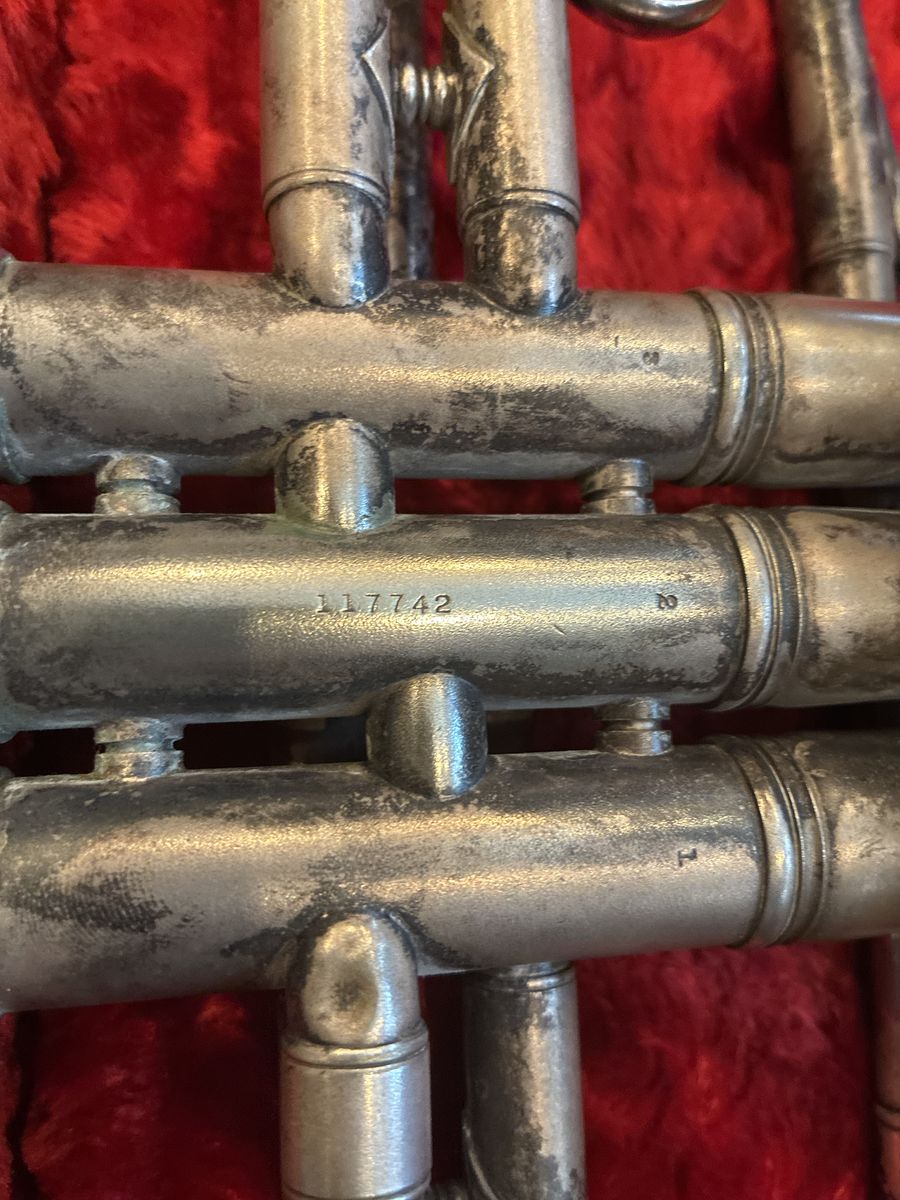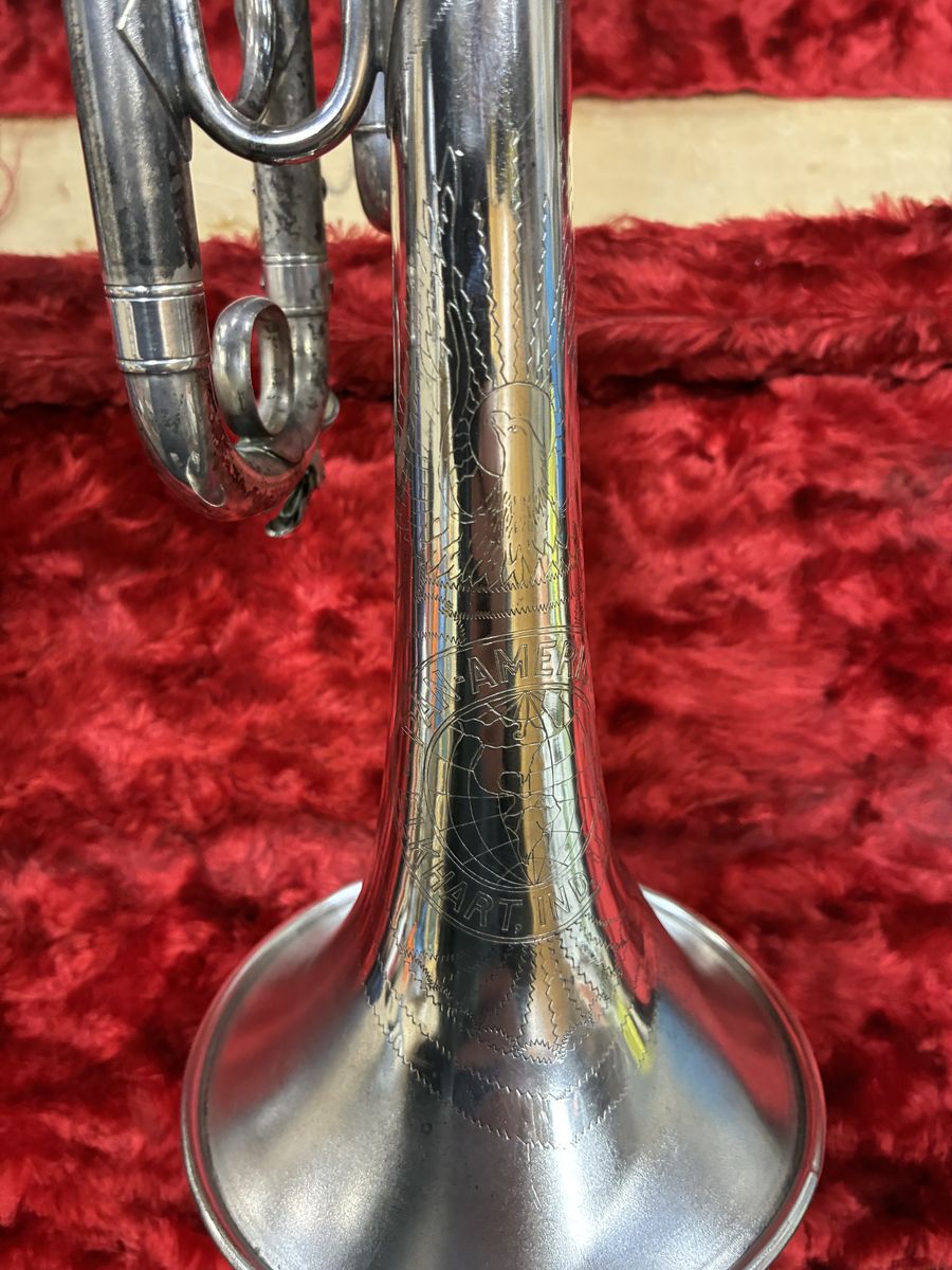 1935 Pan American silver trumpet Model 68B-2 s/n 117742. All valves and tuning slides work perfectly. This is a true vintage instrument in excellent shape. Needs only a bit of polishing.