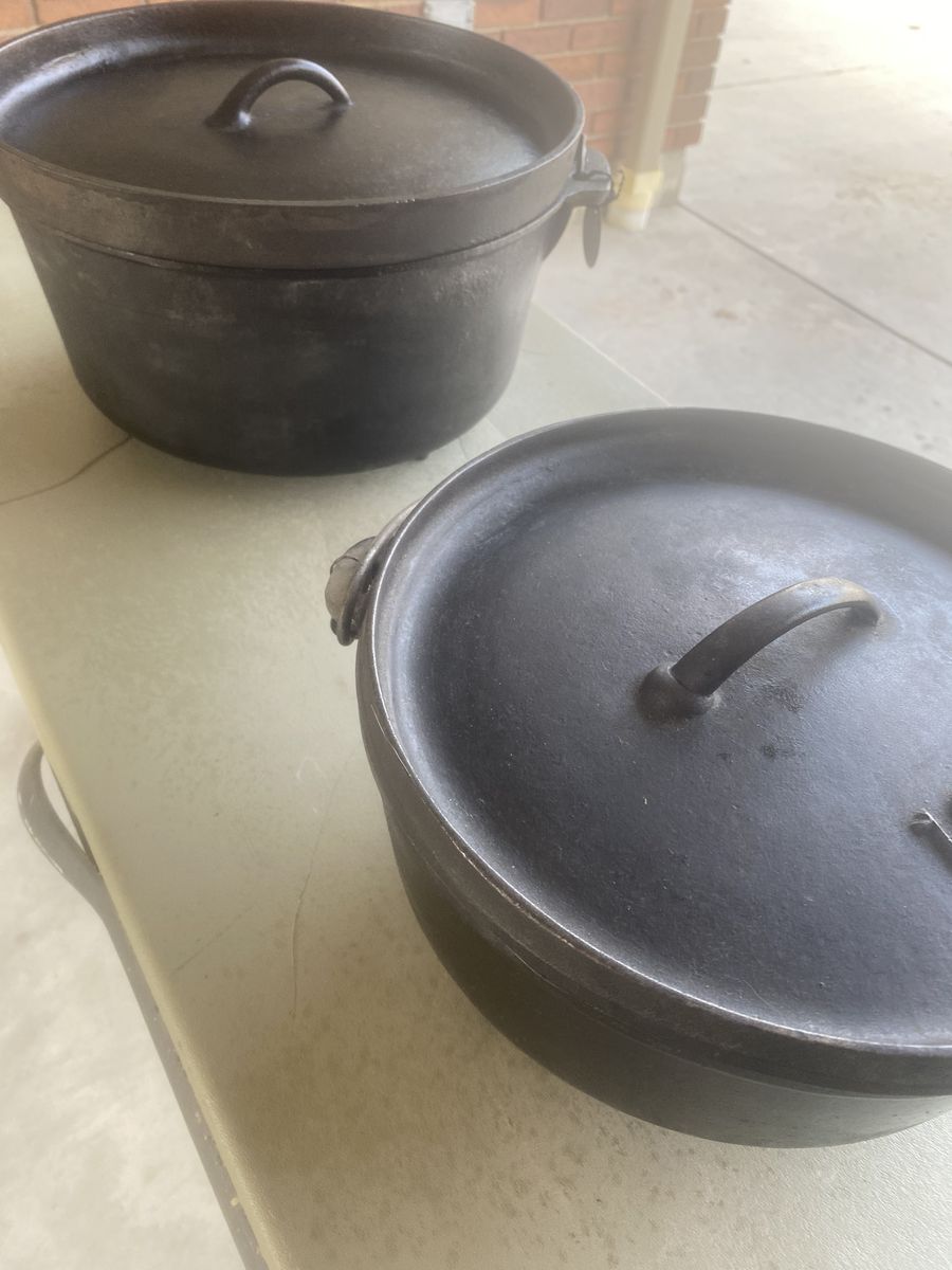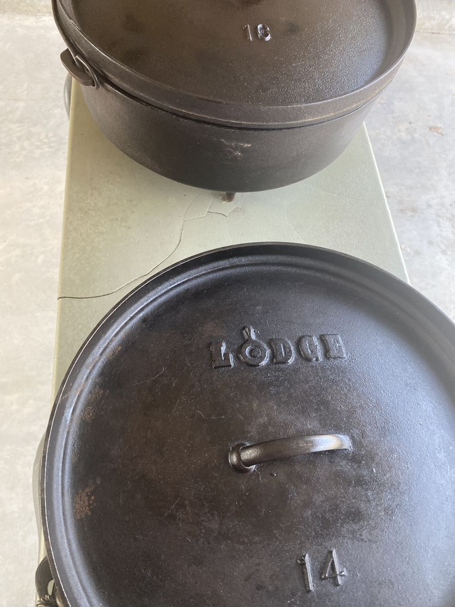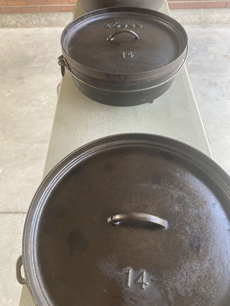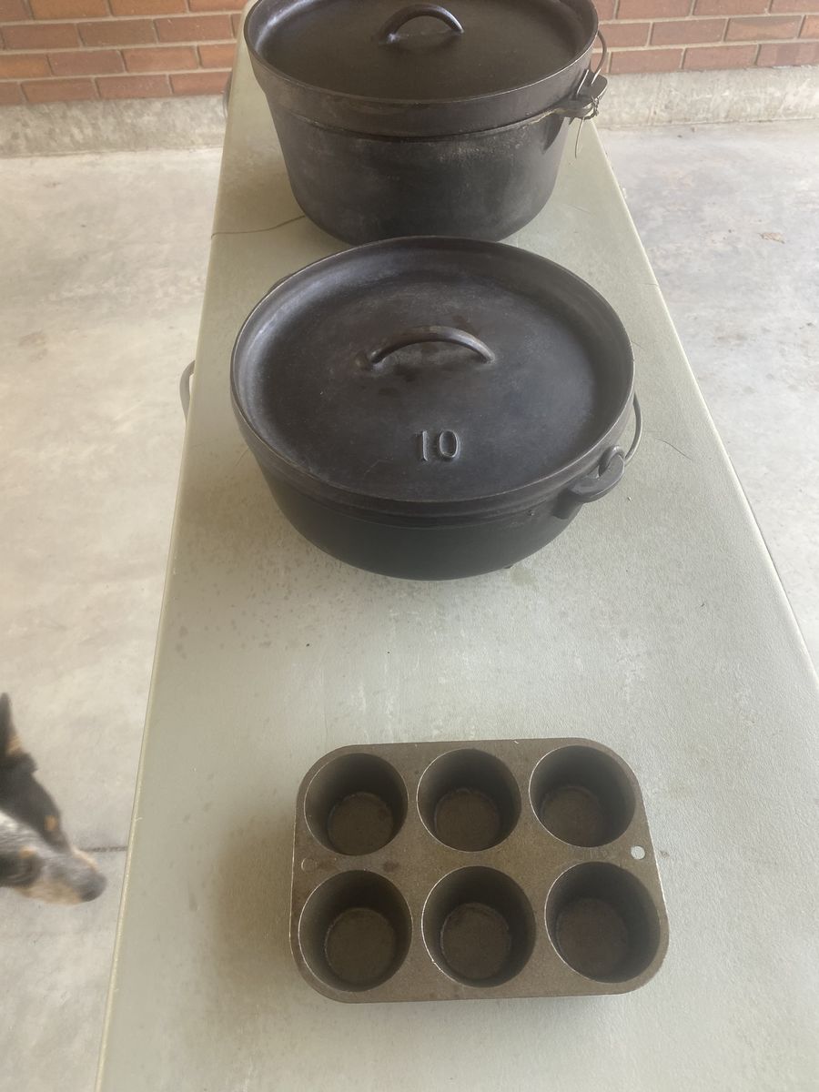 1- 16” Dutch Oven……..$75 2 - 14” Dutch Ovens…..$50 each 1 - 12” Dutch Oven……,,$40 1 - 10” Dutch Oven……..,$30 1 - 12” Skillet Oven……..,$30 1 - 6 Cupcake Pan…………$15