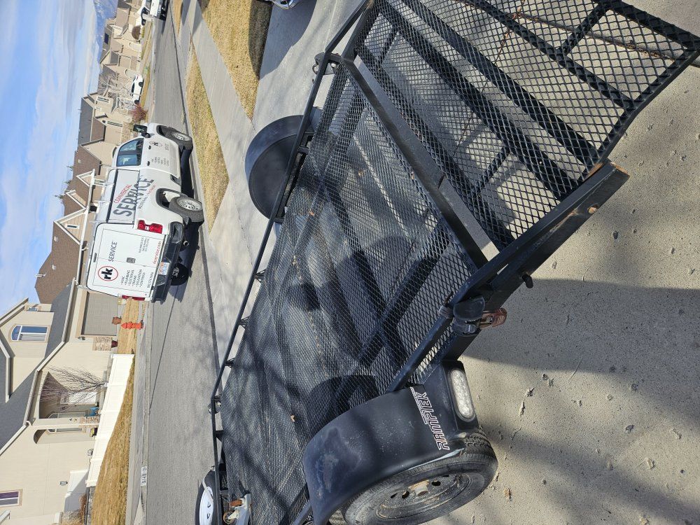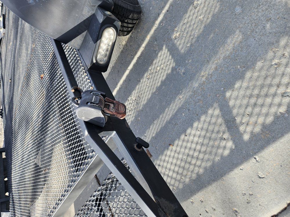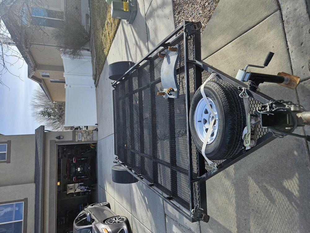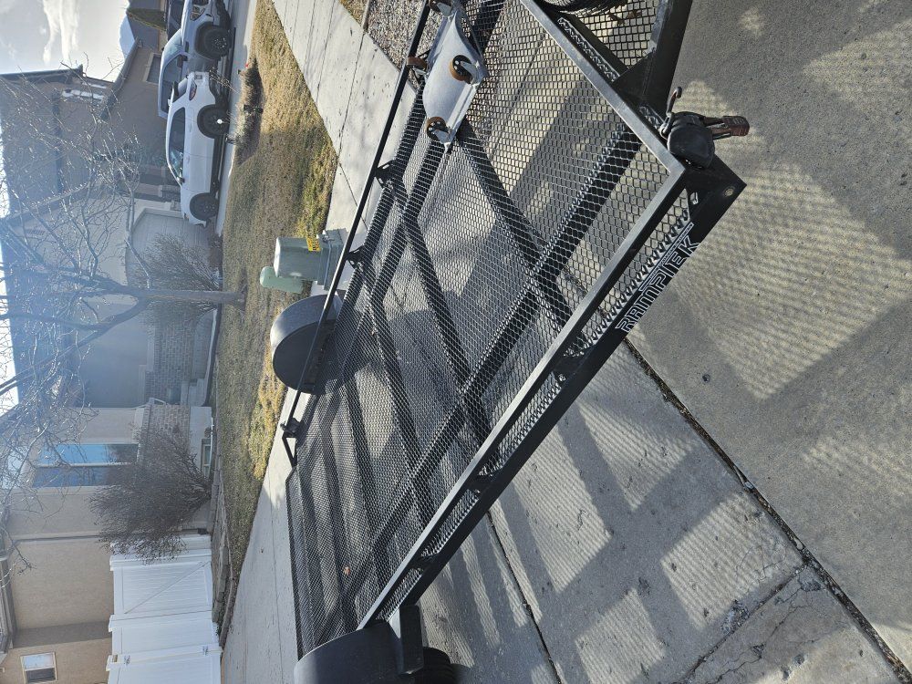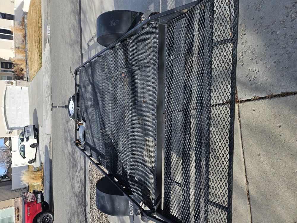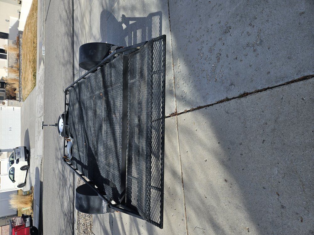 7x14 steel ramptek flat deck trailer. The trailer has a drop down ramp with a 2" sliding coupler. The trailer has LED lights. Spare tire is included. Trailer has attached ratchet straps included.