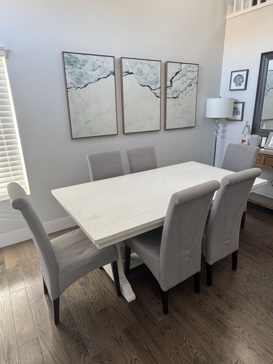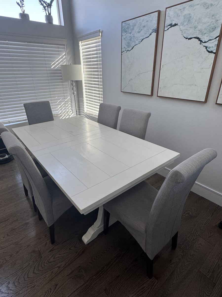 ApplePayBeautiful expandable farmhouse-style dining table with 6 upholstered chairs in great condition.